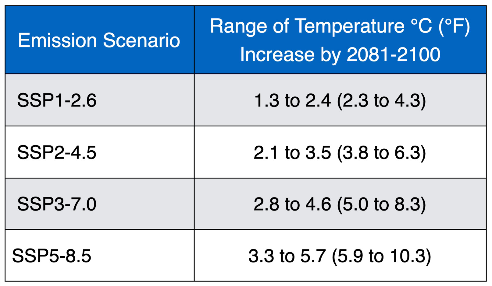 Table 1 Forecasted change in global mean surface air temperature according to the most recent IPCC climate model simulations relative to 1986-2005. Source: IPCC, 2021.
