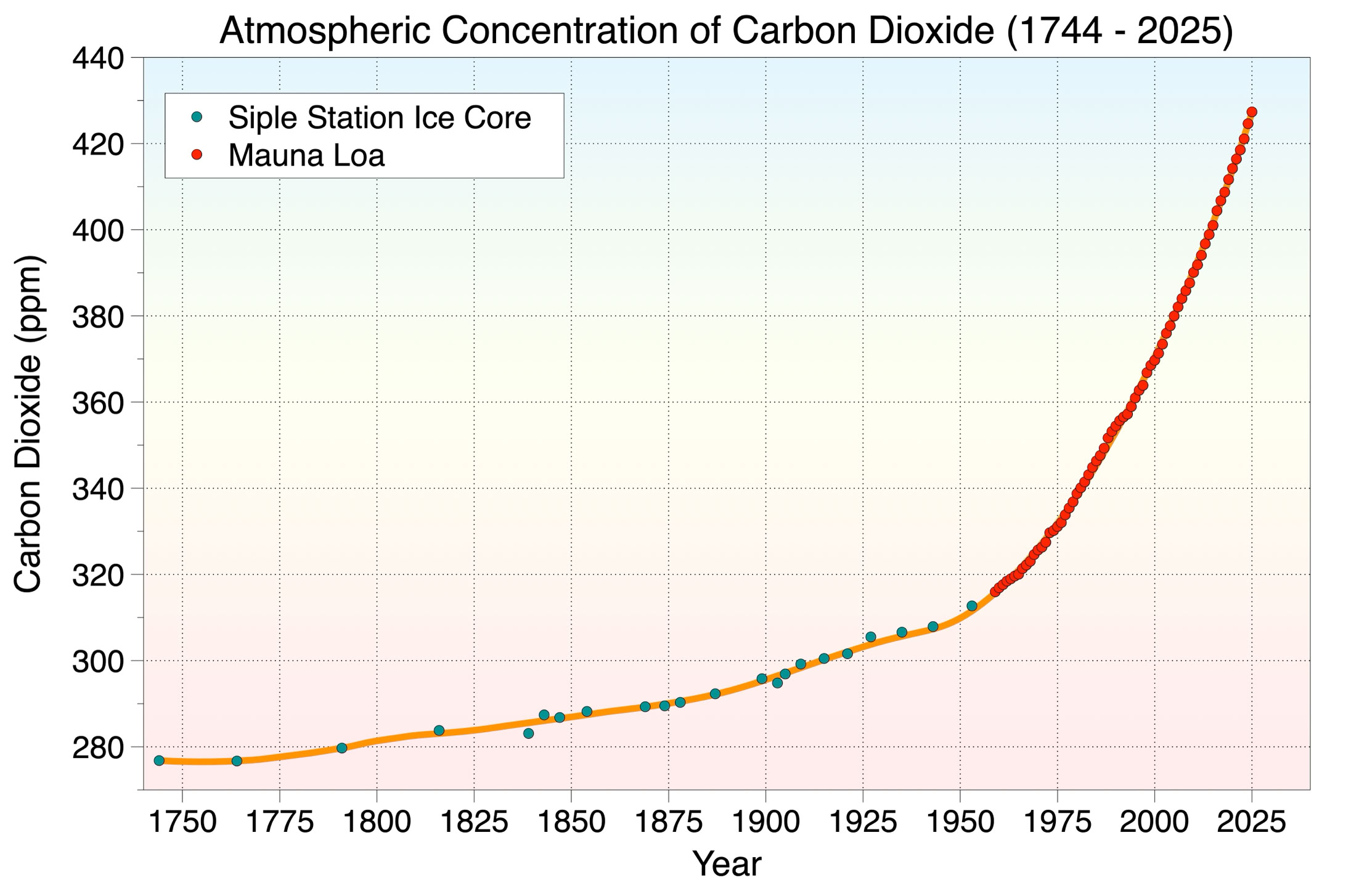 Figure 1 The following graph illustrates the rise in atmospheric carbon dioxide from 1744 to 2025 as measured from the Siple Station, Antarctica, and Mauna Loa, Hawaii. Note that the increase in atmospheric carbon dioxide concentration is exponential. An extrapolation into the immediate future would suggest continued annual increases. Image Copyright: Michael Pidwirny. Data Source: Neftel, A., et al. 1994. Historical carbon dioxide record from the Siple Station ice core. pp. 11-14. In T.A. Boden, D.P. Kaiser, R.J. Sepanski, and F.W. Stoss (eds.) Trends'93: A Compendium of Data on Global Change. ORNL/CDIAC-65. Carbon Dioxide Information Analysis Center, Oak Ridge National Laboratory, Oak Ridge, Tenn., USA and Dr. Pieter Tans, NOAA/ESRL (http:// www.esrl.noaa.gov/gmd/ccgg/trends/) and Dr. Ralph Keeling, Scripps Institution of Oceanography (http://scrippsco2.ucsd.edu/).
