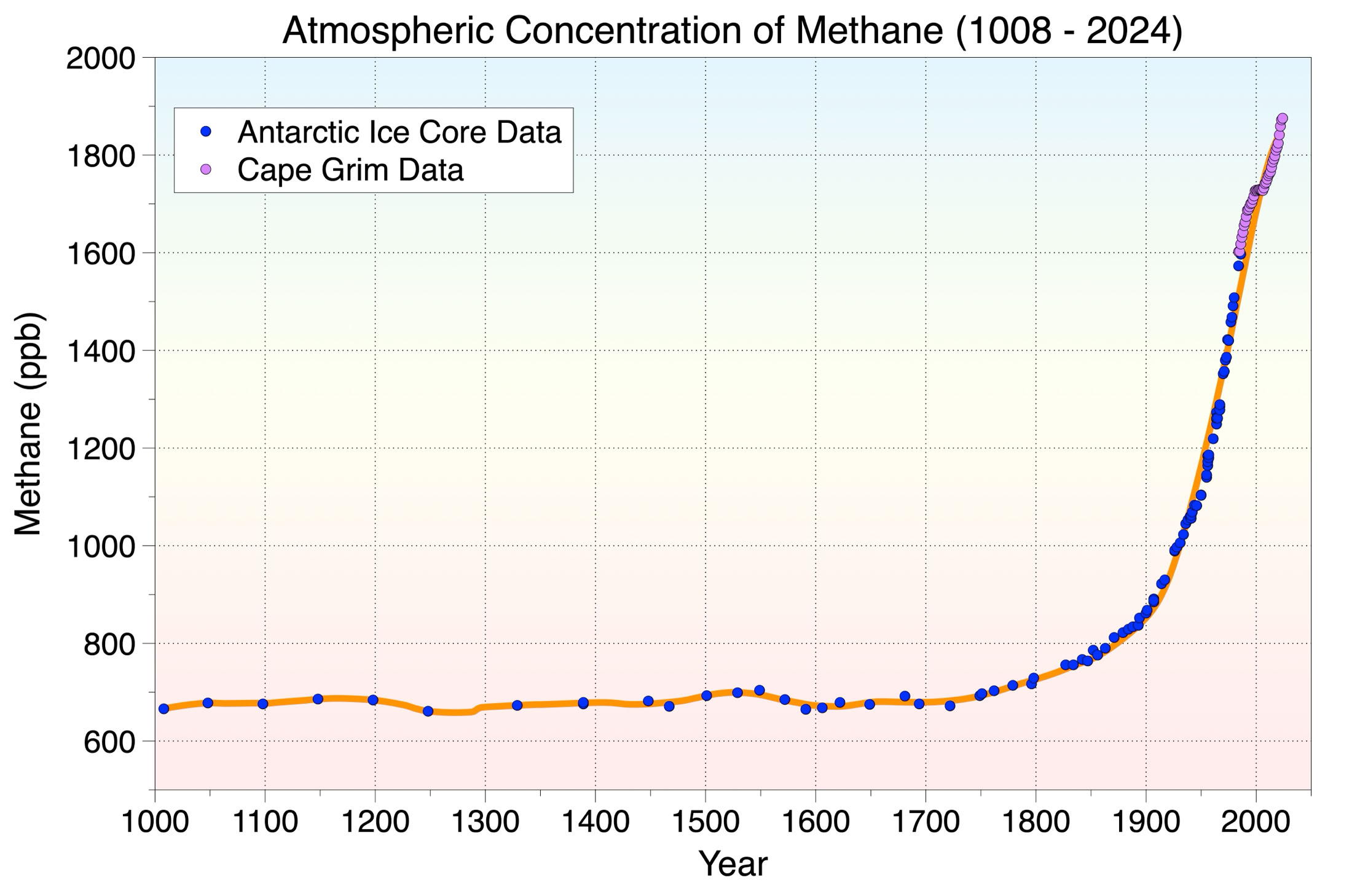Figure 2 The following graph illustrates the rise in atmospheric methane from 1008 to 2024. Note that the increase in atmospheric methane concentration is exponential. An extrapolation into the immediate future would suggest continued annual increases. Image Copyright: Michael Pidwirny. Data Source: D.M. Etheridge, L.P. Steele, R.J. Francey, and R.L. Langenfelds. 2002. Historical CH4 Records Since About 1000 A.D. From Ice Core Data. In Trends: A Compendium of Data on Global Change. Carbon Dioxide Information Analysis Center, Oak Ridge National Laboratory, U.S. Department of Energy, Oak Ridge, Tenn., USA. and NOAA Earth System Research Laboratory, Trends in Atmospheric Methane, http://www.esrl.noaa.gov/gmd/ccgg/trends_ch4/.