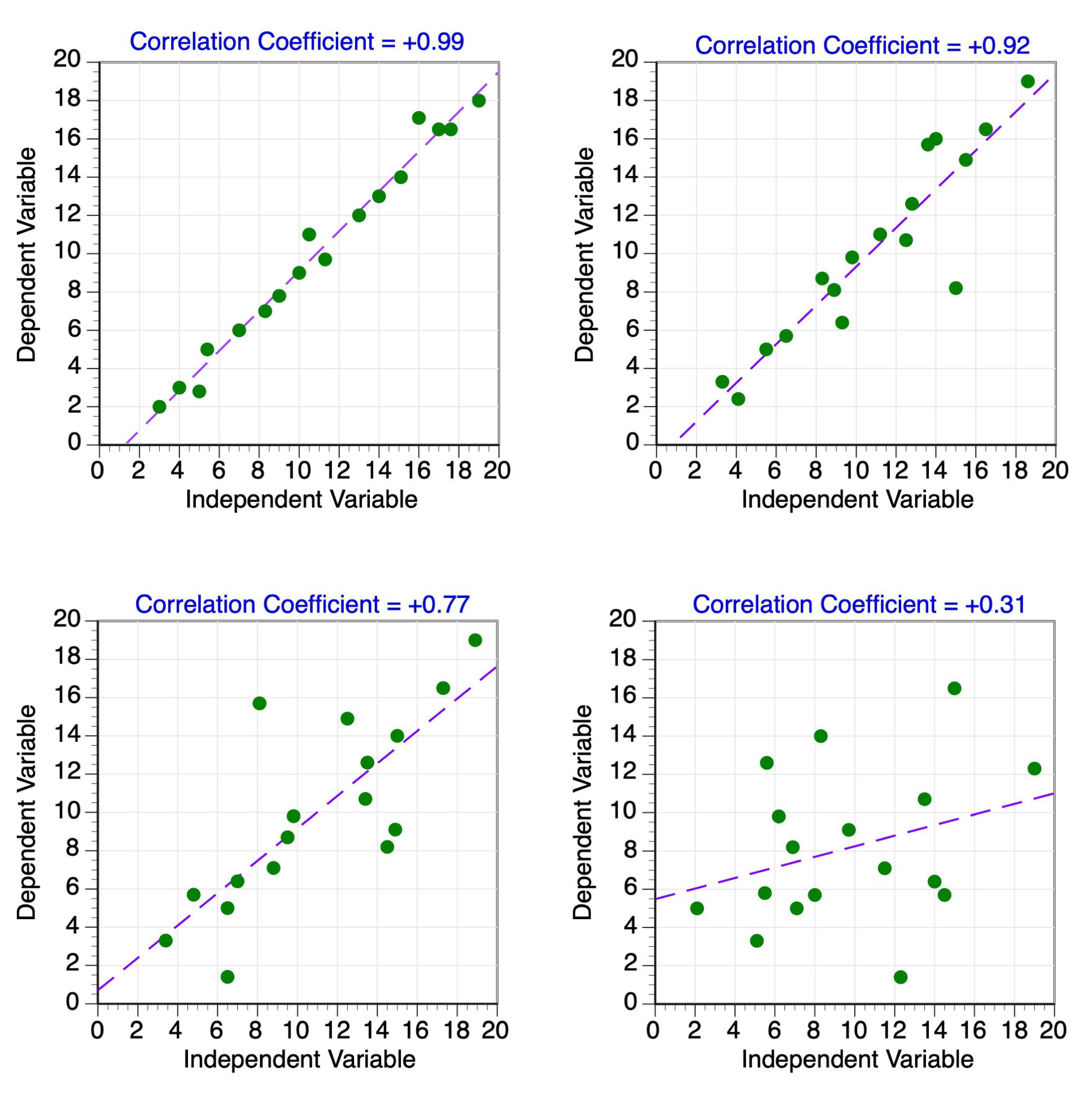 The correlation coefficient is a statistic that measures the strength of the correlation between independent and dependent variables in linear regression analysis. The symbol "r" often represents this statistic (see Figure 3). The value of the correlation coefficient ranges from 1.00 to -1.00 (see Figures 4 and 5). A value of 0.0 indicates that there is absolutely no relationship between the X and Y variables. The strength of the relationship between the X and Y variables increases as the value of r approaches 1.00 and -1.00. Perfect correlation occurs if r equals either 1.00 (perfect positive) or -1.00 (perfect negative). Positive correlation coefficients indicate that an increase in the value of the X variable results in an increase in the value of the Y variable. Negative correlation coefficients indicate that an increase in the value of the X variable results in a decrease in the value of the Y variable.
