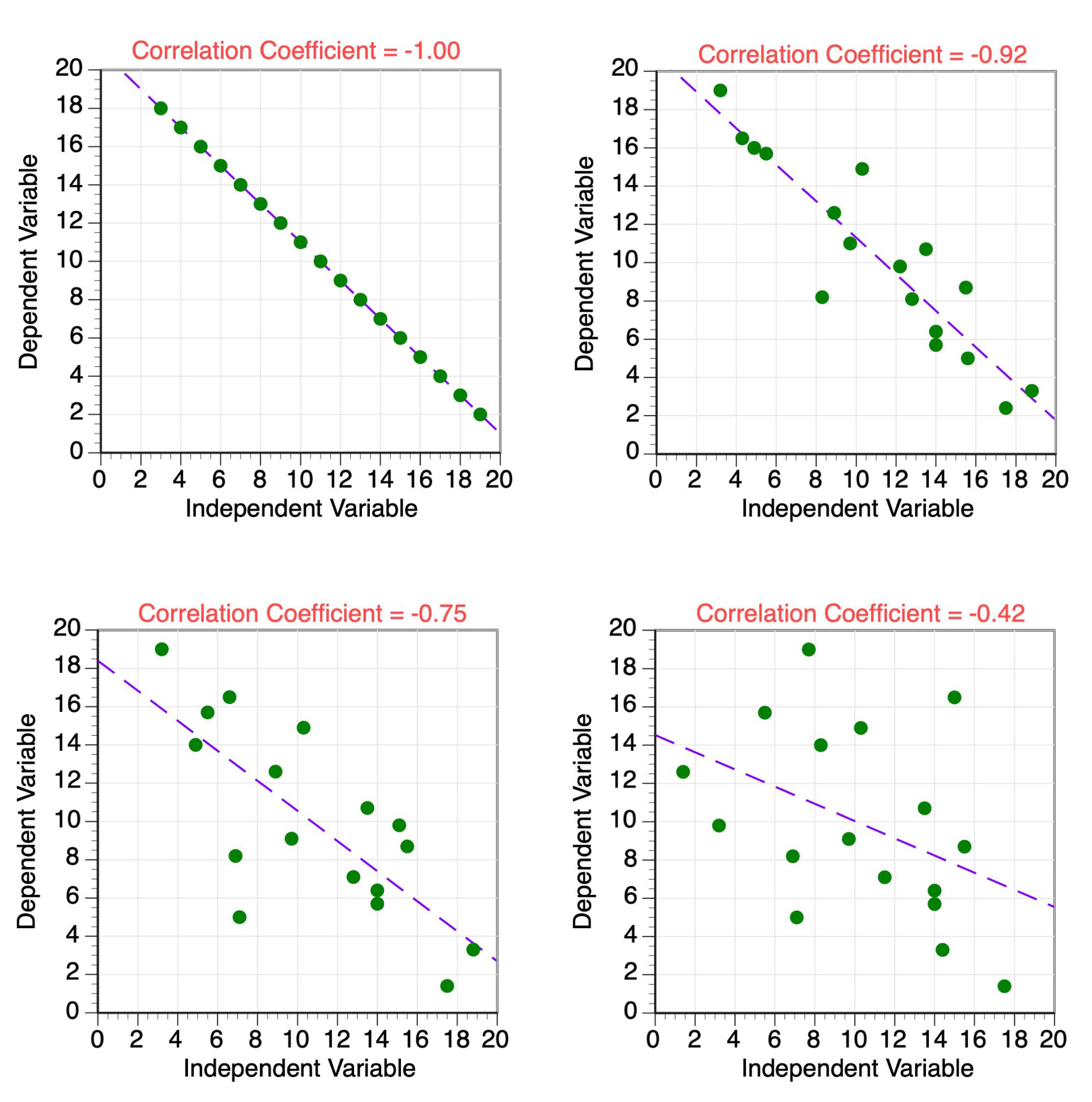 Figure 5 Four examples of data point distributions with varying negative correlation coefficient values. A best-fit regression line through the center of the data points is also shown.