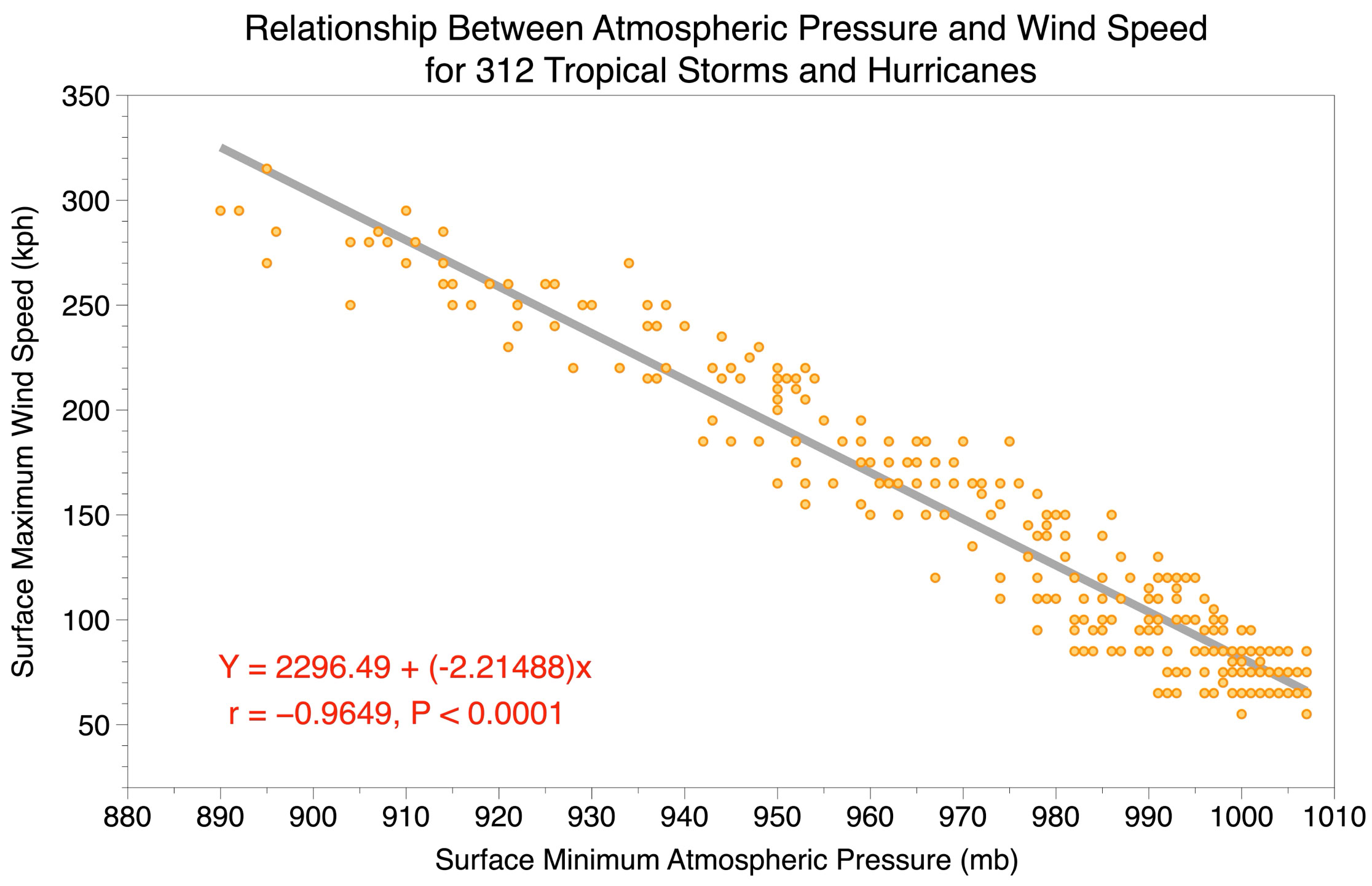Figure 3 Regression best-fit line plotted on a scatterplot of surface minimum atmospheric pressure (X-variable) and surface maximum wind speed (Y-variable) measurements for 312 tropical storms and hurricanes. Also shown is the correlation coefficient (r = -0.9649) and its associated statistical significance or probability value (P < 0.0001).