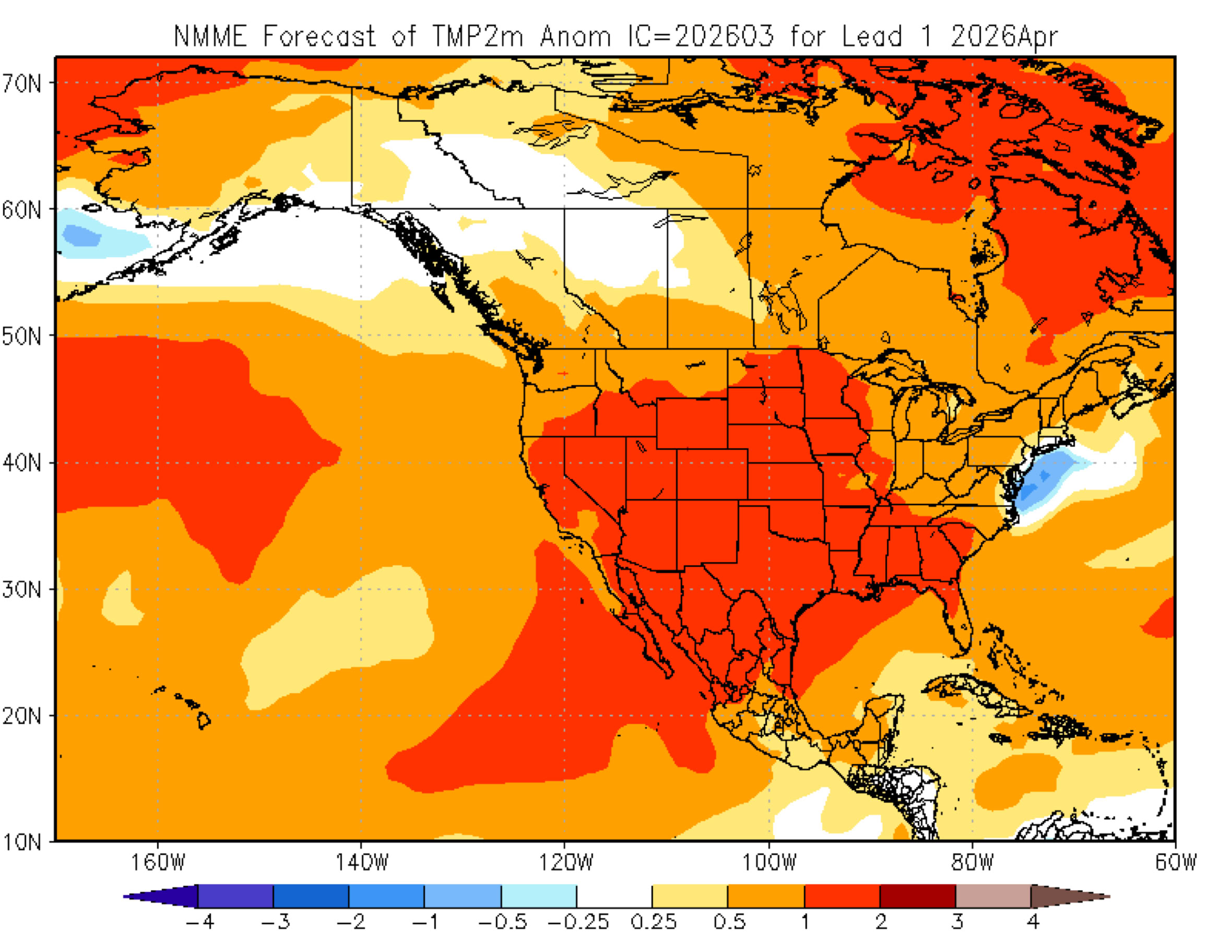 Figure 1 Climate Prediction Center – North American Multi-Model Ensemble temperature forecast for April 2026. March 2026 model run. Shown is the forecasted temperature anomaly relative to the 1991 to 2020 thirty-year average.