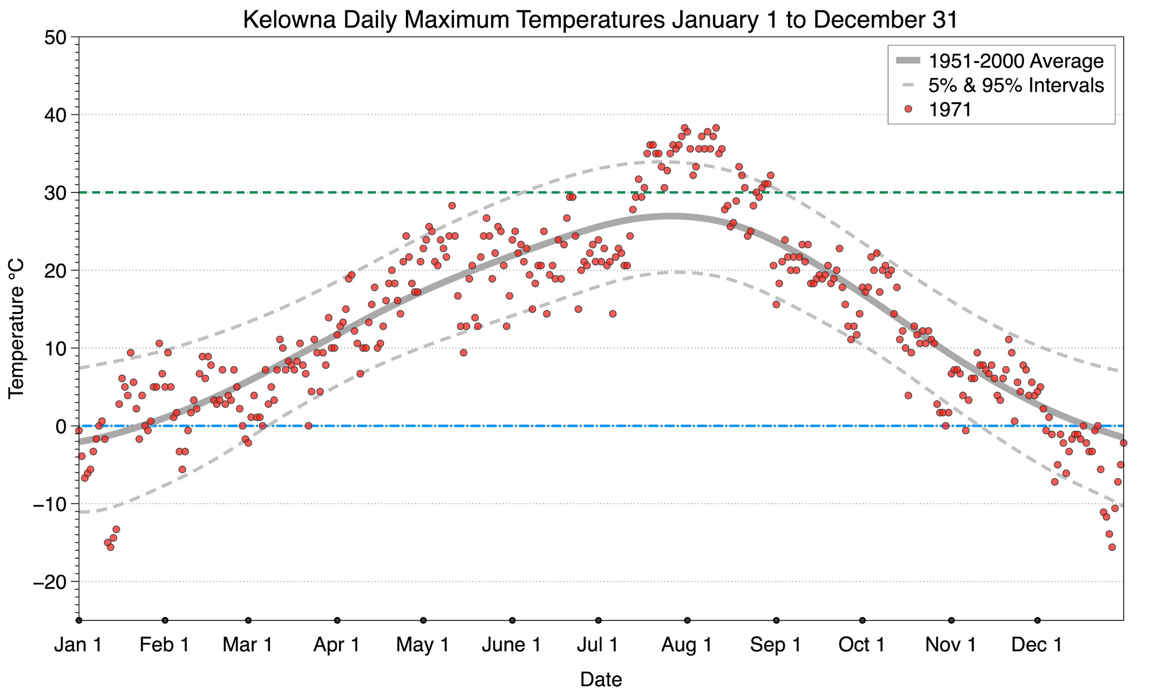 The graph below displays the day-to-day values of maximum daily temperature (red dots) at Kelowna for the year 1971. On this graph, the dark grey thick center line is the average daily temperature calculated from 50 years of data from 1951 to 2000. The dotted light grey lines are the 5% and 95% probability intervals - about 90% of the data from 1951 to 2000 fell within these boundaries. Daily temperatures can be considered as extreme cold or extreme hot events if they that fall outside the 5% or 95% probability intervals, respectively. In Canada, temperatures above 30°C (green dashed line) are considered extreme daily temperatures.