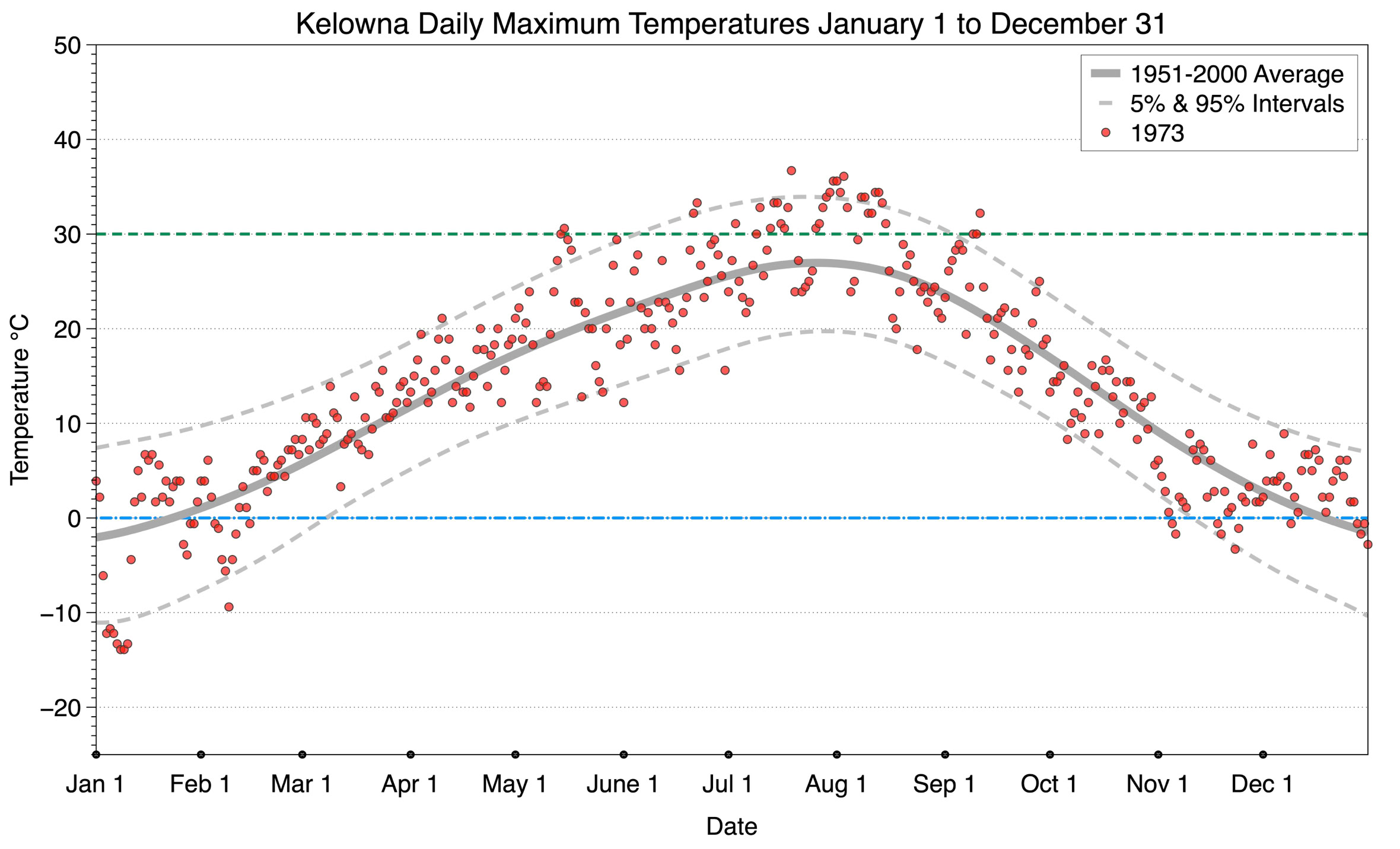 The graph below displays the day-to-day values of maximum daily temperature (red dots) at Kelowna for the year 1973. On this graph, the dark grey thick center line is the average daily temperature calculated from 50 years of data from 1951 to 2000. The dotted light grey lines are the 5% and 95% probability intervals - about 90% of the data from 1951 to 2000 fell within these boundaries. Daily temperatures can be considered as extreme cold or extreme hot events if they that fall outside the 5% or 95% probability intervals, respectively. In Canada, temperatures above 30°C (green dashed line) are considered extreme daily temperatures.