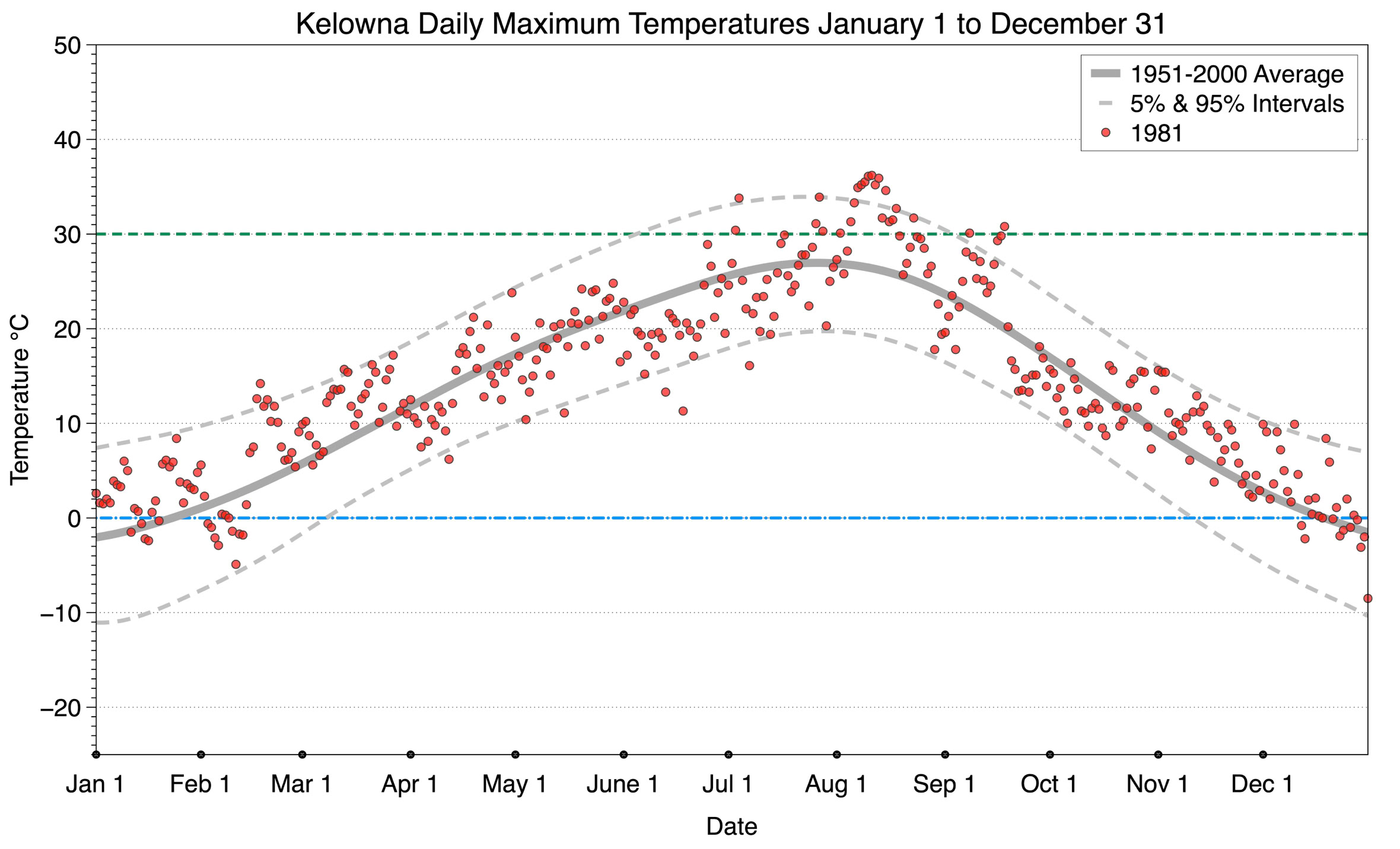 The graph below displays the day-to-day values of maximum daily temperature (red dots) at Kelowna for the year 1981. On this graph, the dark grey thick center line is the average daily temperature calculated from 50 years of data from 1951 to 2000. The dotted light grey lines are the 5% and 95% probability intervals - about 90% of the data from 1951 to 2000 fell within these boundaries. Daily temperatures can be considered as extreme cold or extreme hot events if they that fall outside the 5% or 95% probability intervals, respectively. In Canada, temperatures above 30°C (green dashed line) are considered extreme daily temperatures.