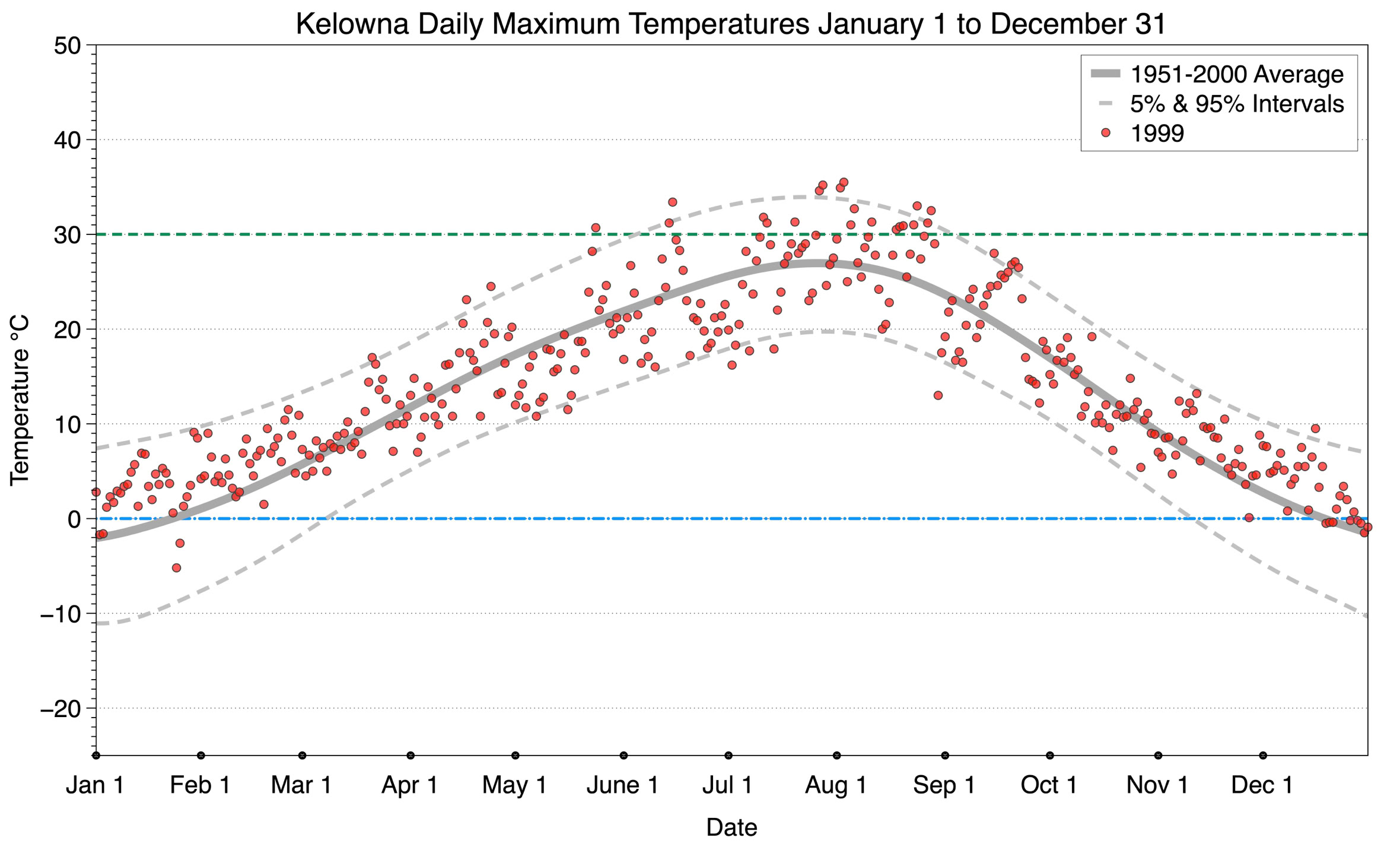 The graph below displays the day-to-day values of maximum daily temperature (red dots) at Kelowna for the year 1999. On this graph, the dark grey thick center line is the average daily temperature calculated from 50 years of data from 1951 to 2000. The dotted light grey lines are the 5% and 95% probability intervals - about 90% of the data from 1951 to 2000 fell within these boundaries. Daily temperatures can be considered as extreme cold or extreme hot events if they that fall outside the 5% or 95% probability intervals, respectively. In Canada, temperatures above 30°C (green dashed line) are considered extreme daily temperatures.
