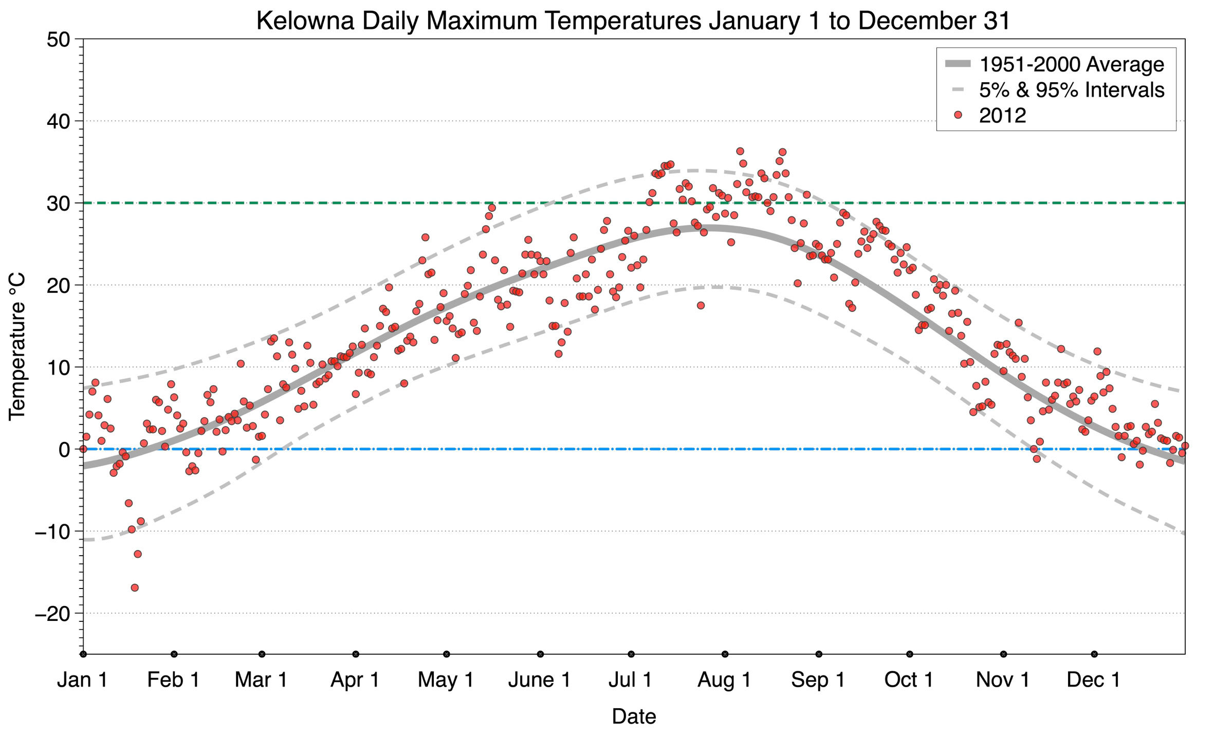 The graph below displays the day-to-day values of maximum daily temperature (red dots) at Kelowna for the year 2012. On this graph, the dark grey thick center line is the average daily temperature calculated from 50 years of data from 1951 to 2000. The dotted light grey lines are the 5% and 95% probability intervals - about 90% of the data from 1951 to 2000 fell within these boundaries. Daily temperatures can be considered as extreme cold or extreme hot events if they that fall outside the 5% or 95% probability intervals, respectively. In Canada, temperatures above 30°C (green dashed line) are considered extreme daily temperatures.