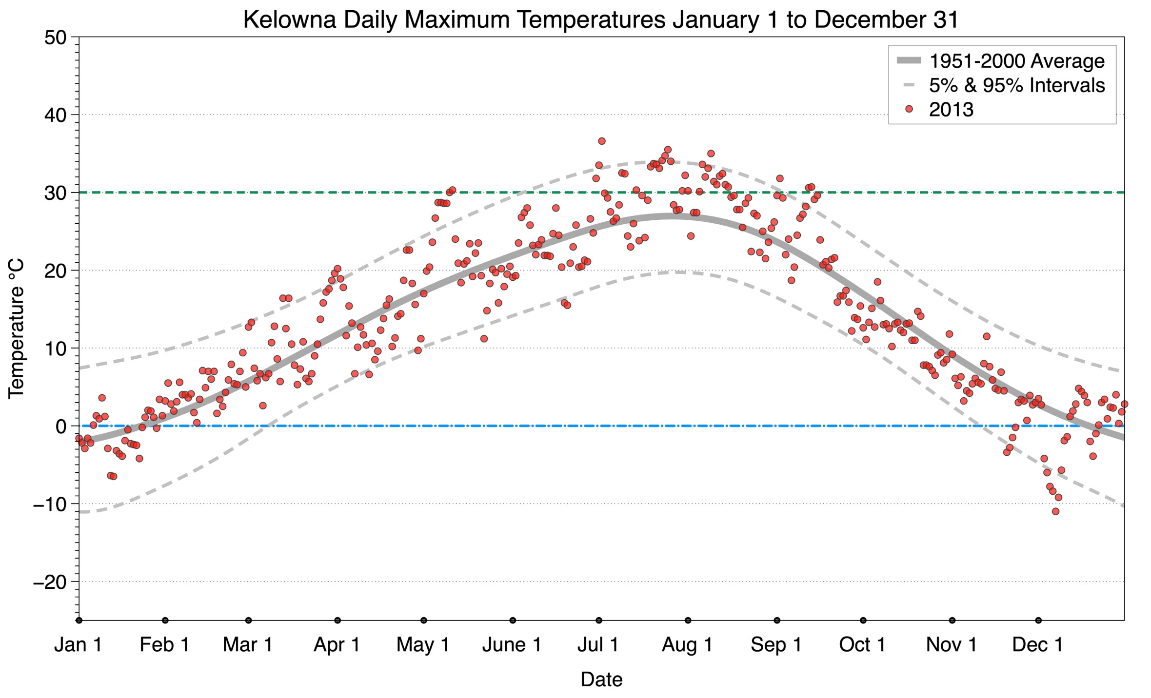 The graph below displays the day-to-day values of maximum daily temperature (red dots) at Kelowna for the year 2013. On this graph, the dark grey thick center line is the average daily temperature calculated from 50 years of data from 1951 to 2000. The dotted light grey lines are the 5% and 95% probability intervals - about 90% of the data from 1951 to 2000 fell within these boundaries. Daily temperatures can be considered as extreme cold or extreme hot events if they that fall outside the 5% or 95% probability intervals, respectively. In Canada, temperatures above 30°C (green dashed line) are considered extreme daily temperatures.