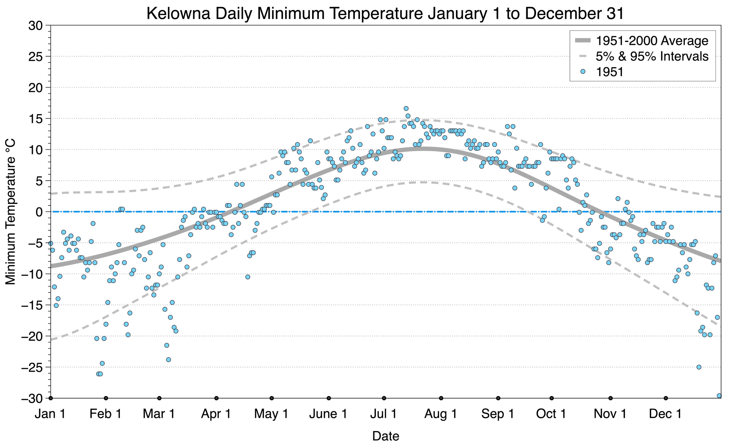 The graph below displays the day-to-day values of minimum daily temperature (blue dots) at Kelowna for the year 1951. On this graph, the dark grey thick center line is the average daily temperature calculated from 50 years of data from 1951 to 2000. The dotted light grey lines are the 5% and 95% probability intervals - about 90% of the data from 1951 to 2000 fell within these boundaries. Daily temperatures can be considered as extreme cold or extreme hot events if they that fall outside the 5% or 95% probability intervals, respectively.