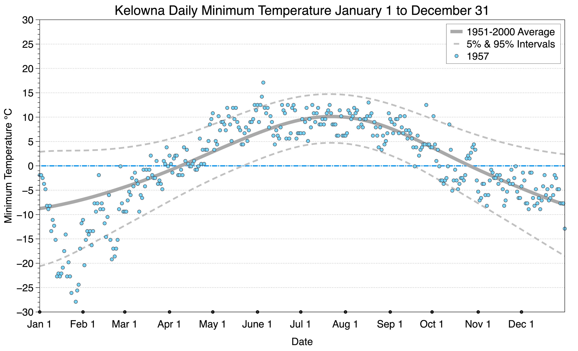 The graph below displays the day-to-day values of minimum daily temperature (blue dots) at Kelowna for the year 1957. On this graph, the dark grey thick center line is the average daily temperature calculated from 50 years of data from 1951 to 2000. The dotted light grey lines are the 5% and 95% probability intervals - about 90% of the data from 1951 to 2000 fell within these boundaries. Daily temperatures can be considered as extreme cold or extreme hot events if they that fall outside the 5% or 95% probability intervals, respectively.