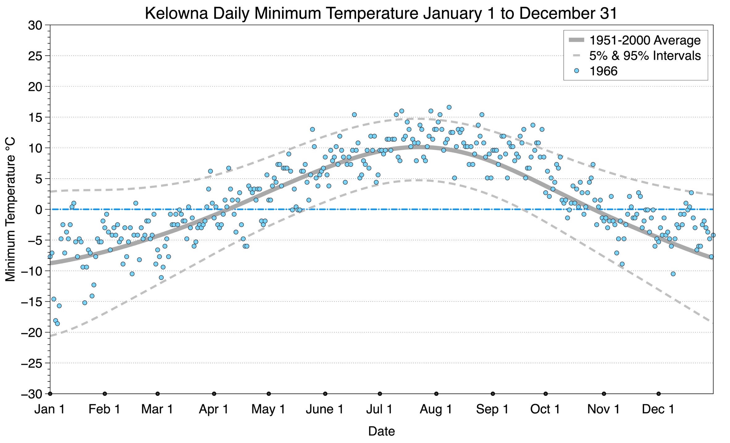 The graph below displays the day-to-day values of minimum daily temperature (blue dots) at Kelowna for the year 1966. On this graph, the dark grey thick center line is the average daily temperature calculated from 50 years of data from 1951 to 2000. The dotted light grey lines are the 5% and 95% probability intervals - about 90% of the data from 1951 to 2000 fell within these boundaries. Daily temperatures can be considered as extreme cold or extreme hot events if they that fall outside the 5% or 95% probability intervals, respectively.