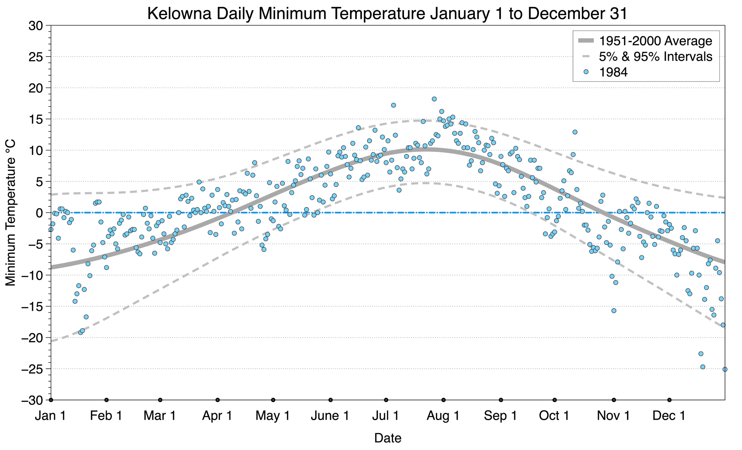 The graph below displays the day-to-day values of minimum daily temperature (blue dots) at Kelowna for the year 1984. On this graph, the dark grey thick center line is the average daily temperature calculated from 50 years of data from 1951 to 2000. The dotted light grey lines are the 5% and 95% probability intervals - about 90% of the data from 1951 to 2000 fell within these boundaries. Daily temperatures can be considered as extreme cold or extreme hot events if they that fall outside the 5% or 95% probability intervals, respectively.