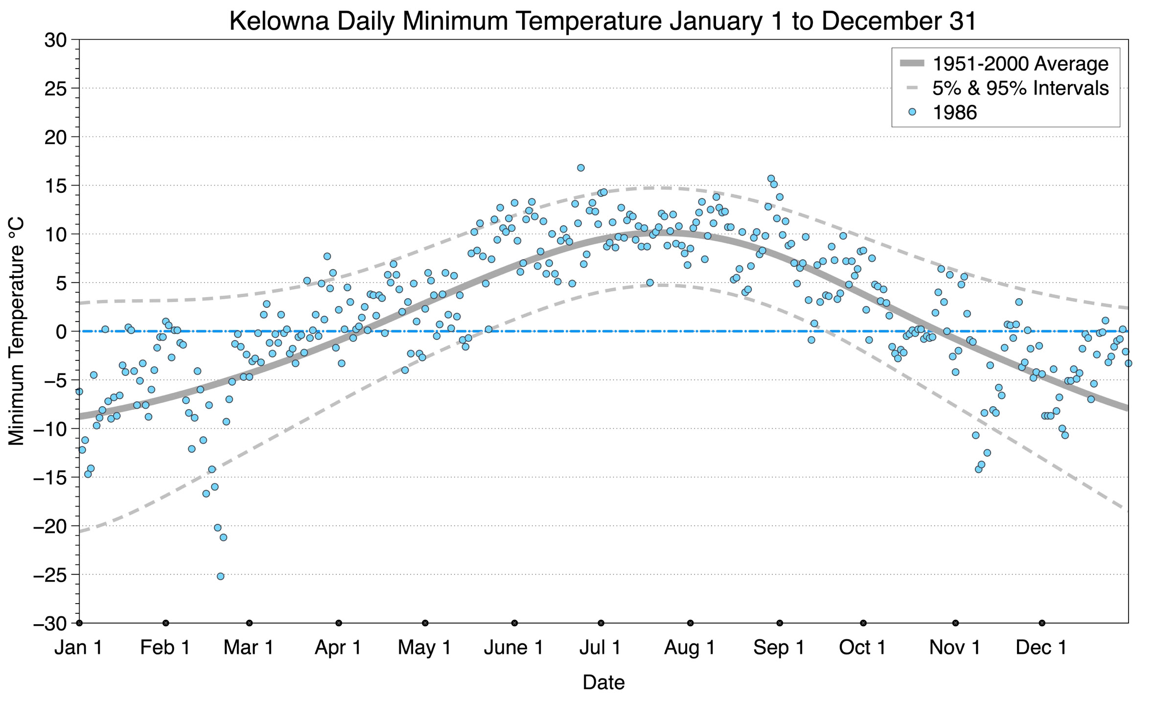 The graph below displays the day-to-day values of minimum daily temperature (blue dots) at Kelowna for the year 1986. On this graph, the dark grey thick center line is the average daily temperature calculated from 50 years of data from 1951 to 2000. The dotted light grey lines are the 5% and 95% probability intervals - about 90% of the data from 1951 to 2000 fell within these boundaries. Daily temperatures can be considered as extreme cold or extreme hot events if they that fall outside the 5% or 95% probability intervals, respectively.