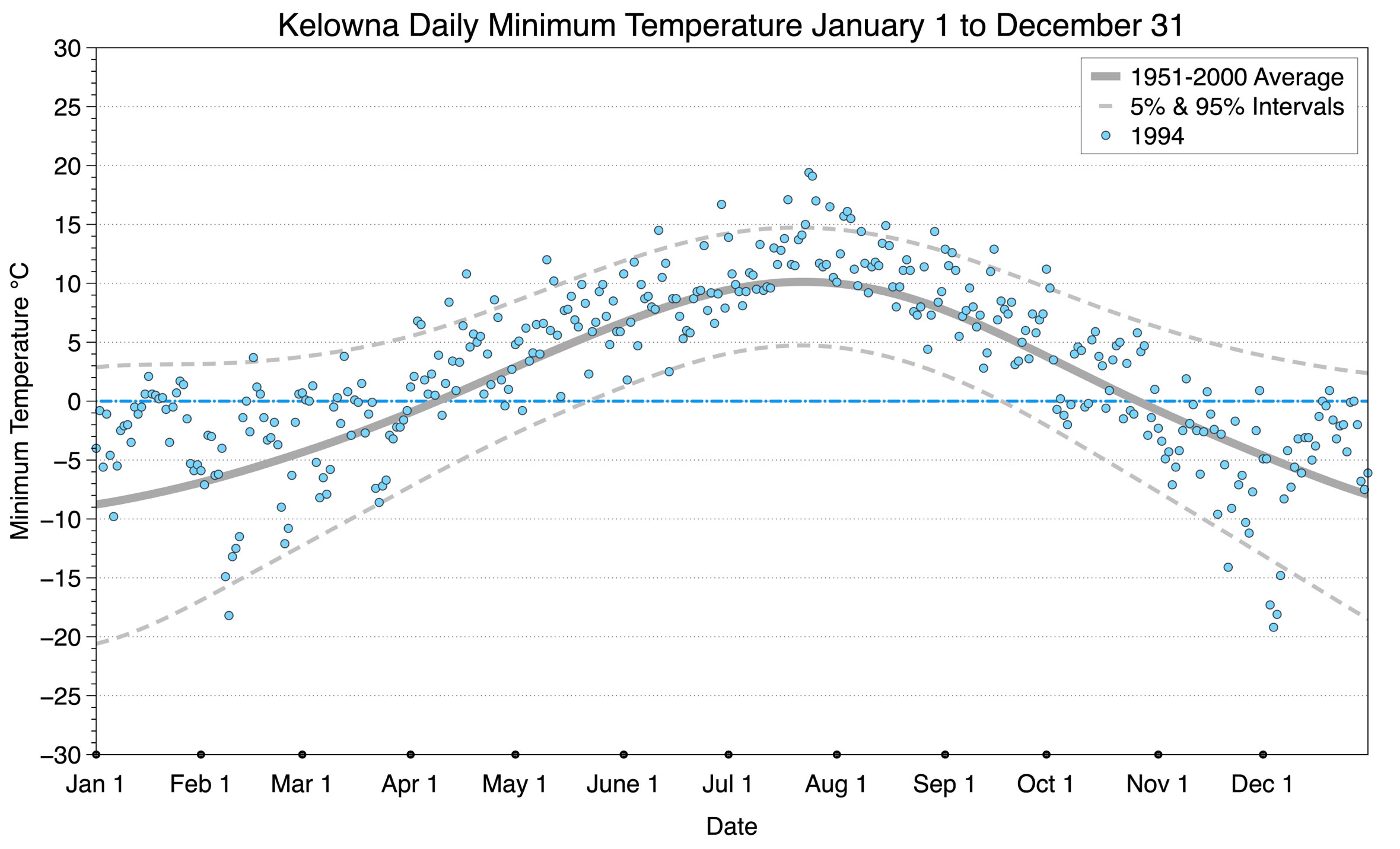 The graph below displays the day-to-day values of minimum daily temperature (blue dots) at Kelowna for the year 1994. On this graph, the dark grey thick center line is the average daily temperature calculated from 50 years of data from 1951 to 2000. The dotted light grey lines are the 5% and 95% probability intervals - about 90% of the data from 1951 to 2000 fell within these boundaries. Daily temperatures can be considered as extreme cold or extreme hot events if they that fall outside the 5% or 95% probability intervals, respectively.