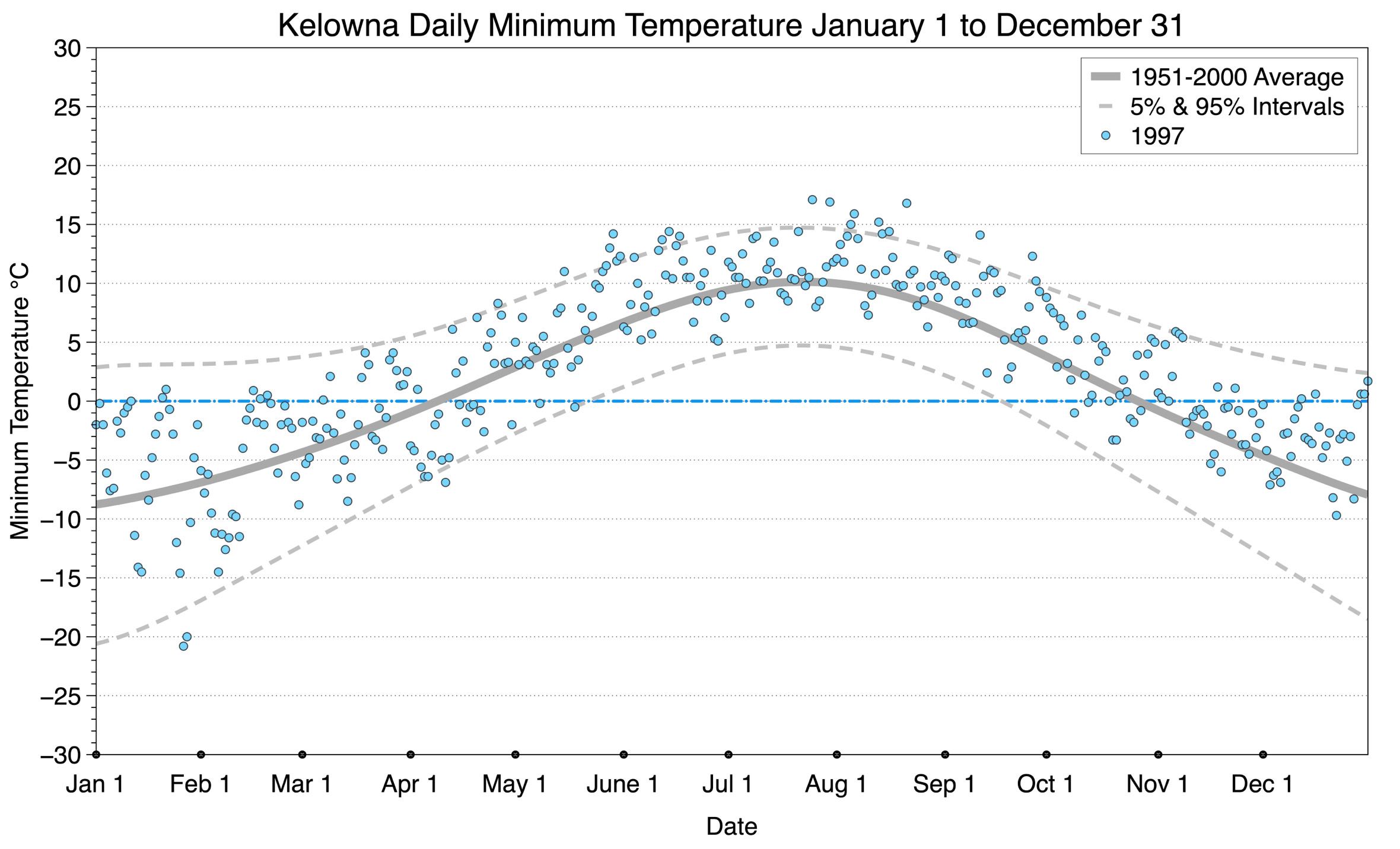 The graph below displays the day-to-day values of minimum daily temperature (blue dots) at Kelowna for the year 1997. On this graph, the dark grey thick center line is the average daily temperature calculated from 50 years of data from 1951 to 2000. The dotted light grey lines are the 5% and 95% probability intervals - about 90% of the data from 1951 to 2000 fell within these boundaries. Daily temperatures can be considered as extreme cold or extreme hot events if they that fall outside the 5% or 95% probability intervals, respectively.