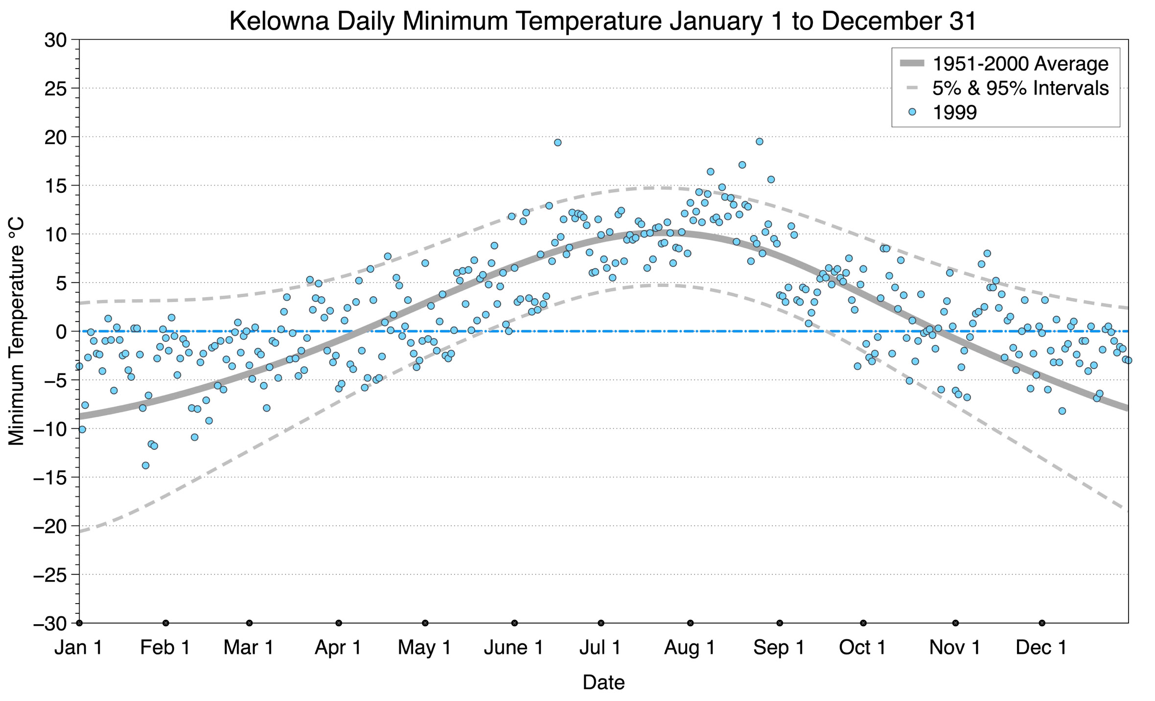 The graph below displays the day-to-day values of minimum daily temperature (blue dots) at Kelowna for the year 1999. On this graph, the dark grey thick center line is the average daily temperature calculated from 50 years of data from 1951 to 2000. The dotted light grey lines are the 5% and 95% probability intervals - about 90% of the data from 1951 to 2000 fell within these boundaries. Daily temperatures can be considered as extreme cold or extreme hot events if they that fall outside the 5% or 95% probability intervals, respectively.