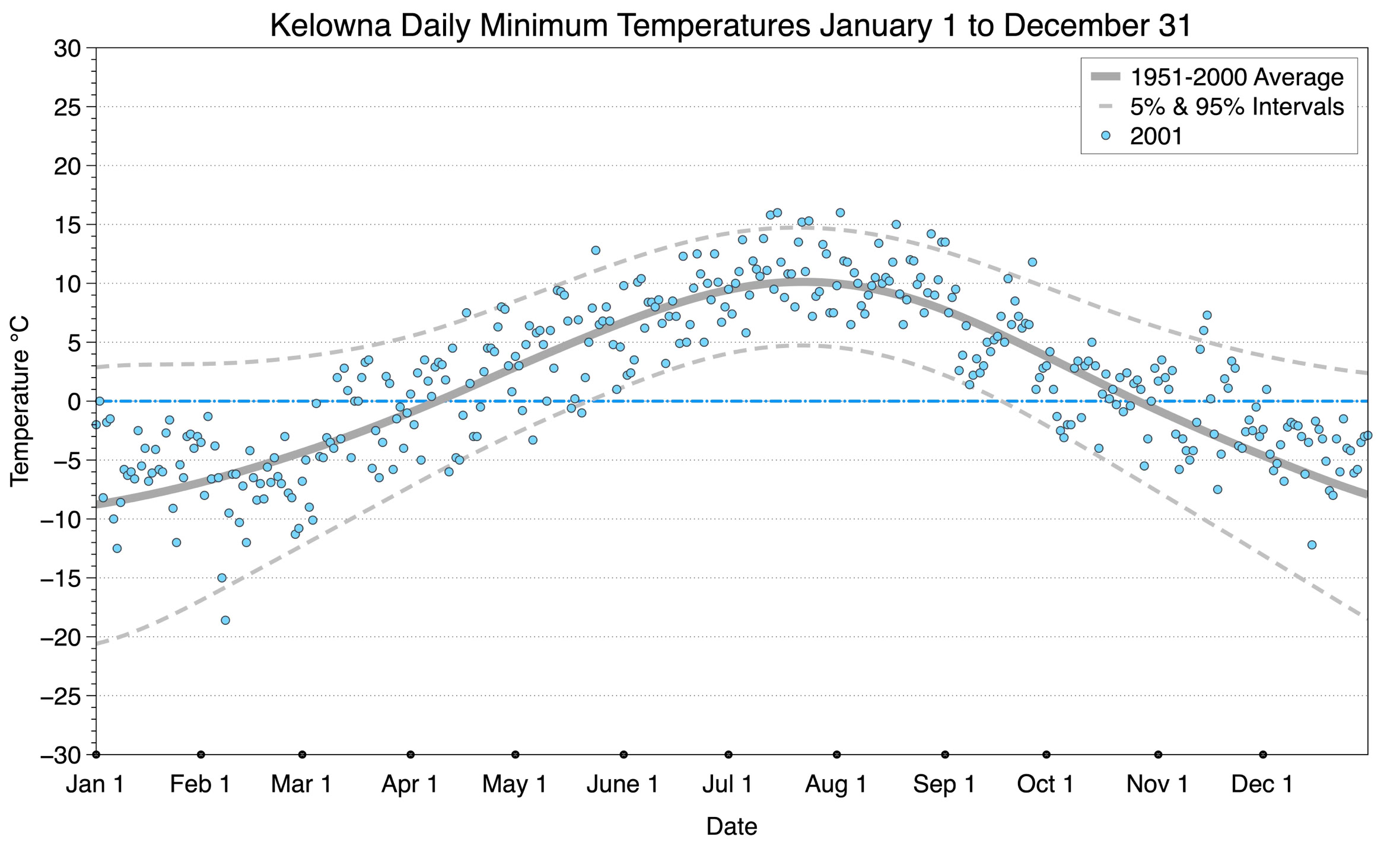 The graph below displays the day-to-day values of minimum daily temperature (blue dots) at Kelowna for the year 2001. On this graph, the dark grey thick center line is the average daily temperature calculated from 50 years of data from 1951 to 2000. The dotted light grey lines are the 5% and 95% probability intervals - about 90% of the data from 1951 to 2000 fell within these boundaries. Daily temperatures can be considered as extreme cold or extreme hot events if they that fall outside the 5% or 95% probability intervals, respectively.