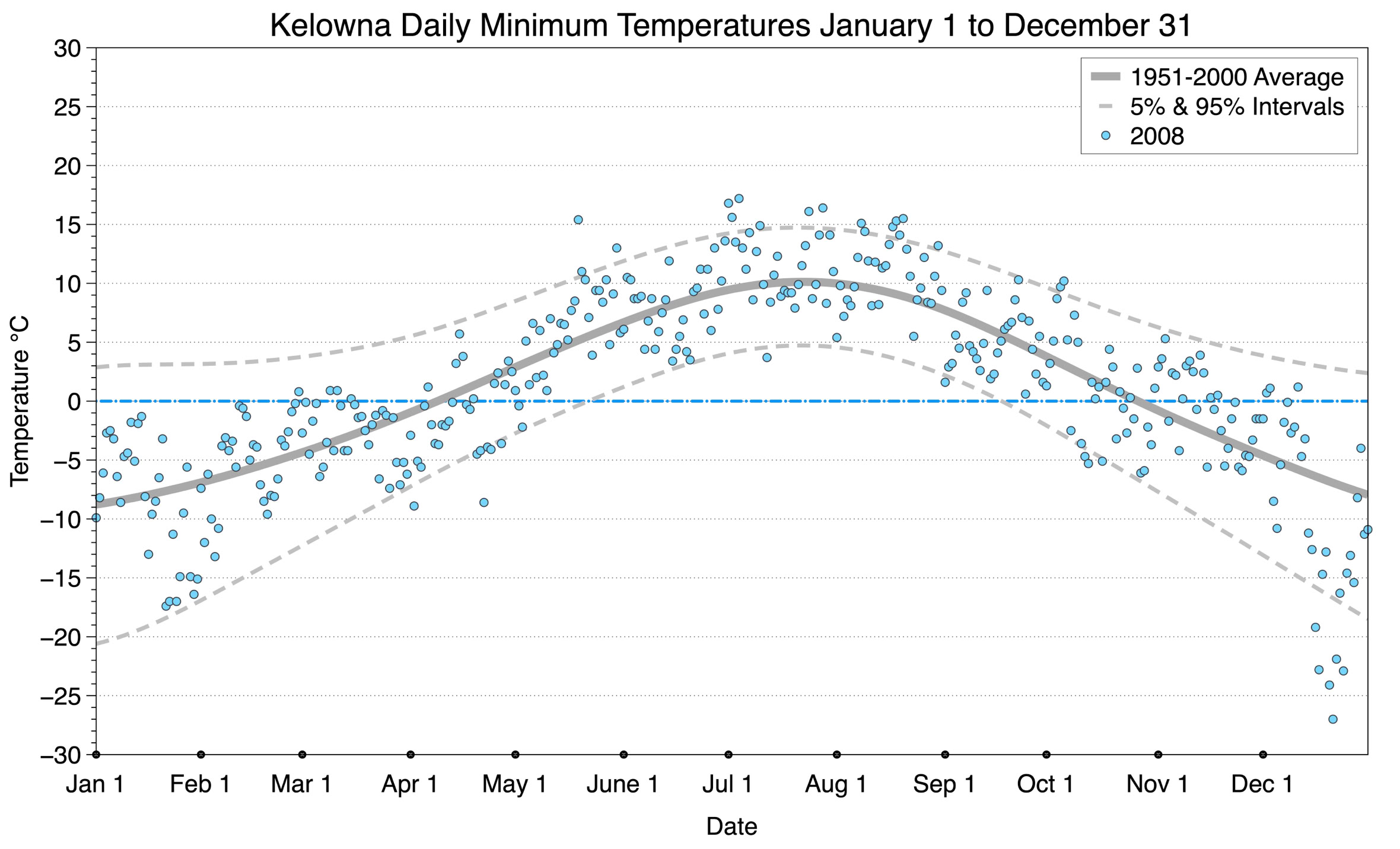The graph below displays the day-to-day values of minimum daily temperature (blue dots) at Kelowna for the year 2008. On this graph, the dark grey thick center line is the average daily temperature calculated from 50 years of data from 1951 to 2000. The dotted light grey lines are the 5% and 95% probability intervals - about 90% of the data from 1951 to 2000 fell within these boundaries. Daily temperatures can be considered as extreme cold or extreme hot events if they that fall outside the 5% or 95% probability intervals, respectively.