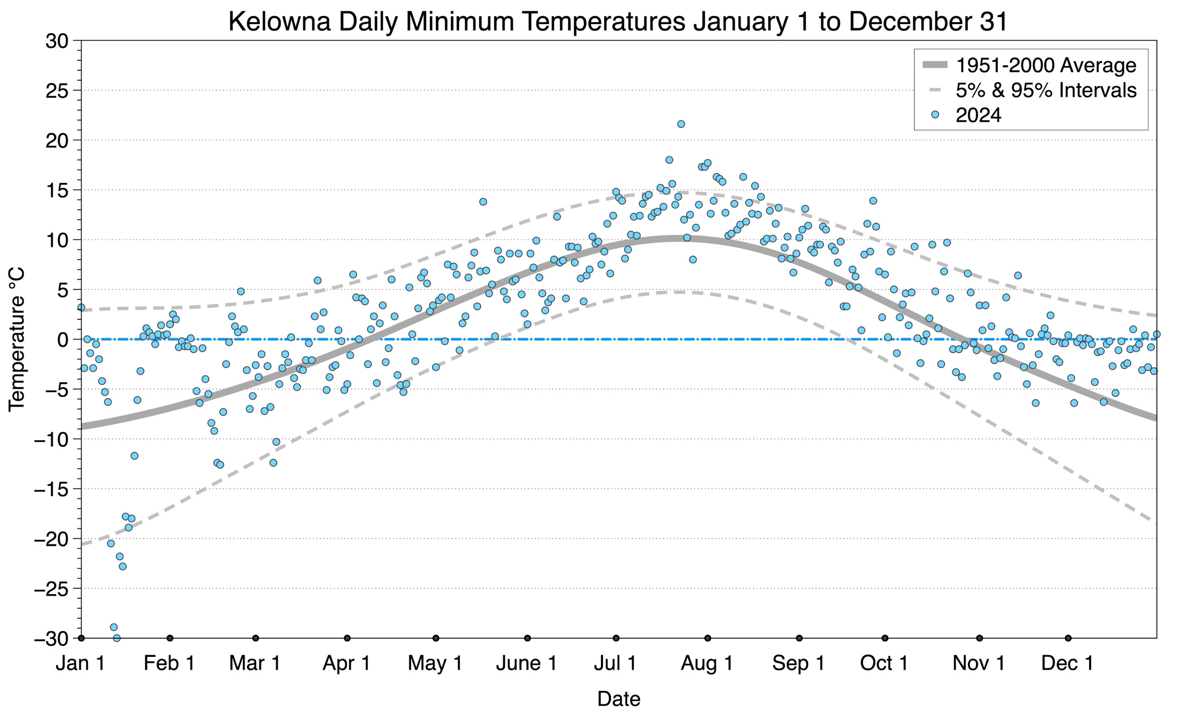 The graph below displays the day-to-day values of minimum daily temperature (blue dots) at Kelowna for the year 2024. On this graph, the dark grey thick center line is the average daily temperature calculated from 50 years of data from 1951 to 2000. The dotted light grey lines are the 5% and 95% probability intervals - about 90% of the data from 1951 to 2000 fell within these boundaries. Daily temperatures can be considered as extreme cold or extreme hot events if they that fall outside the 5% or 95% probability intervals, respectively.