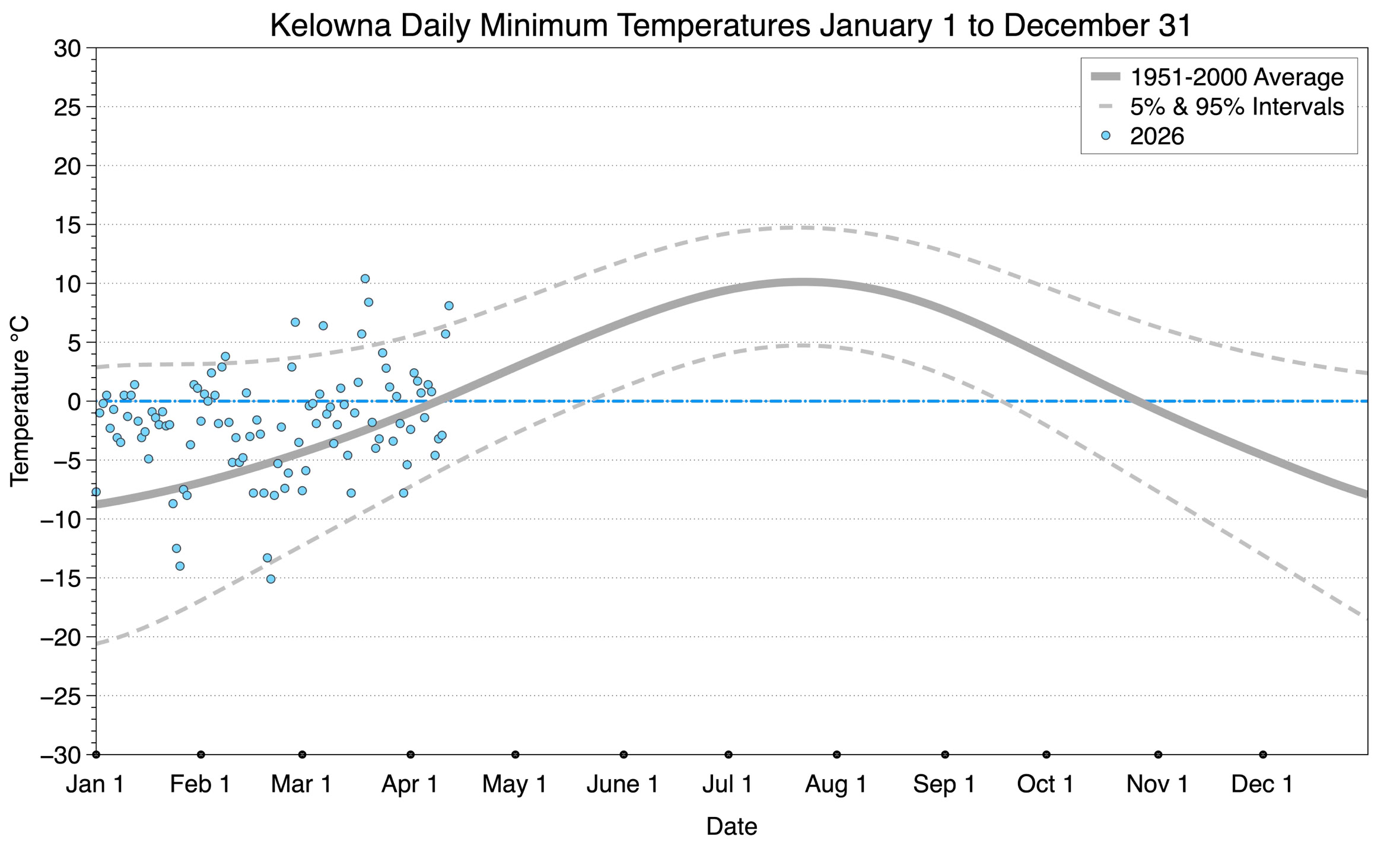 The graph below displays the day-to-day values of minimum daily temperature (blue dots) at Kelowna for the year 2026. On this graph, the dark grey thick center line is the average daily temperature calculated from 50 years of data from 1951 to 2000. The dotted light grey lines are the 5% and 95% probability intervals - about 90% of the data from 1951 to 2000 fell within these boundaries. Daily temperatures can be considered as extreme cold or extreme hot events if they that fall outside the 5% or 95% probability intervals, respectively.
