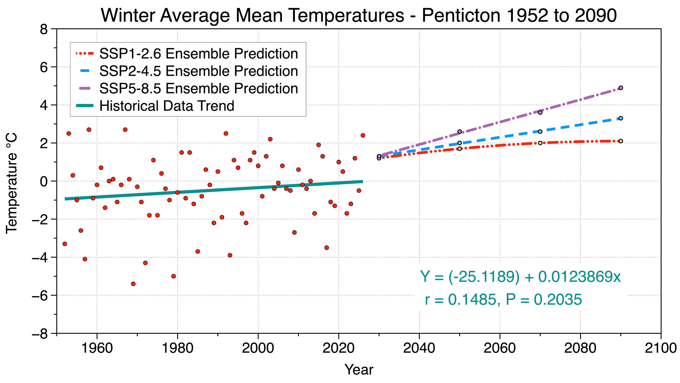 Figure 6 Eight-model ensemble forecasted changes in Penticton’s winter average mean temperature under SSP1-2.6, SSP2-4.5, and SSP5-8.5 emission scenarios from 2030 to 2090. Also shown is the historical measurements of winter average mean temperature from 1952 to 2026, and a best-fit linear regression line (teal colored) describing the average change in this climate variable during this period.