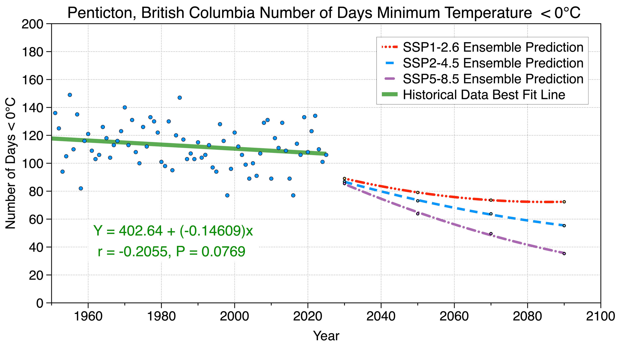 Figure 10 Eight-model ensemble forecasted changes in Penticton’s annual number of days with a minimum temperature less than (<) 0°C under SSP1-2.6, SSP2-4.5, and SSP5-8.5 emission scenarios from 2030 to 2090. Also shown is the historical measurements of the annual number of days with a minimum temperature less than (<) 0°C from 1951-2025, and a best-fit linear regression line (green line) describing the average change in this climate variable during this period.