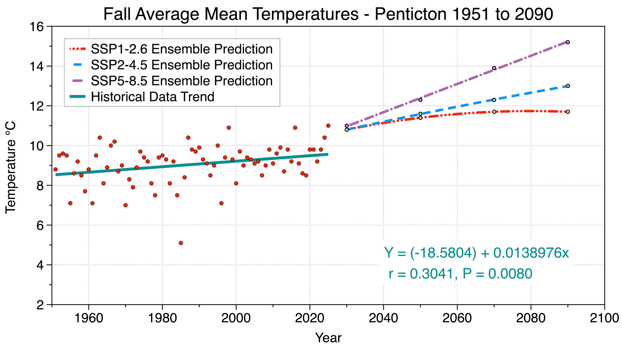 Figure 5 Eight-model ensemble forecasted changes in Penticton’s fall average mean temperature under SSP1-2.6, SSP2-4.5, and SSP5-8.5 emission scenarios from 2030 to 2090. Also shown is the historical measurements of fall average mean temperature from 1951-2025, and a best-fit linear regression line (teal colored) describing the average change in this climate variable during this period.