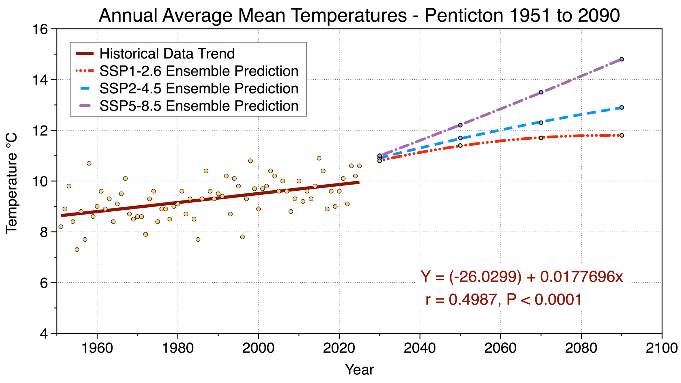 Figure 1 Eight-model ensemble forecasted changes in Penticton’s annual average mean temperature under SSP1-2.6, SSP2-4.5, and SSP5-8.5 emission scenarios from 2030 to 2090. Also shown is the historical measurements of annual average mean temperature from 1951-2025, and a best-fit linear regression line (brown colored) describing the average change in this climate variable during this period.