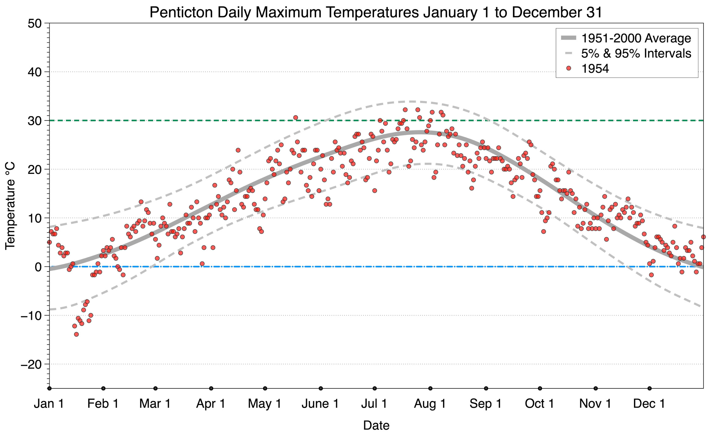 The graph below displays the day-to-day values of maximum daily temperature (red dots) at Penticton for the year 1954. On this graph, the dark grey thick center line is the average daily temperature calculated from 50 years of data from 1951 to 2000. The dotted light grey lines are the 5% and 95% probability intervals - about 90% of the data from 1951 to 2000 fell within these boundaries. Daily temperatures can be considered as extreme cold or extreme hot events if they that fall outside the 5% or 95% probability intervals, respectively. In Canada, temperatures above 30°C (green dashed line) are considered extreme daily temperatures.