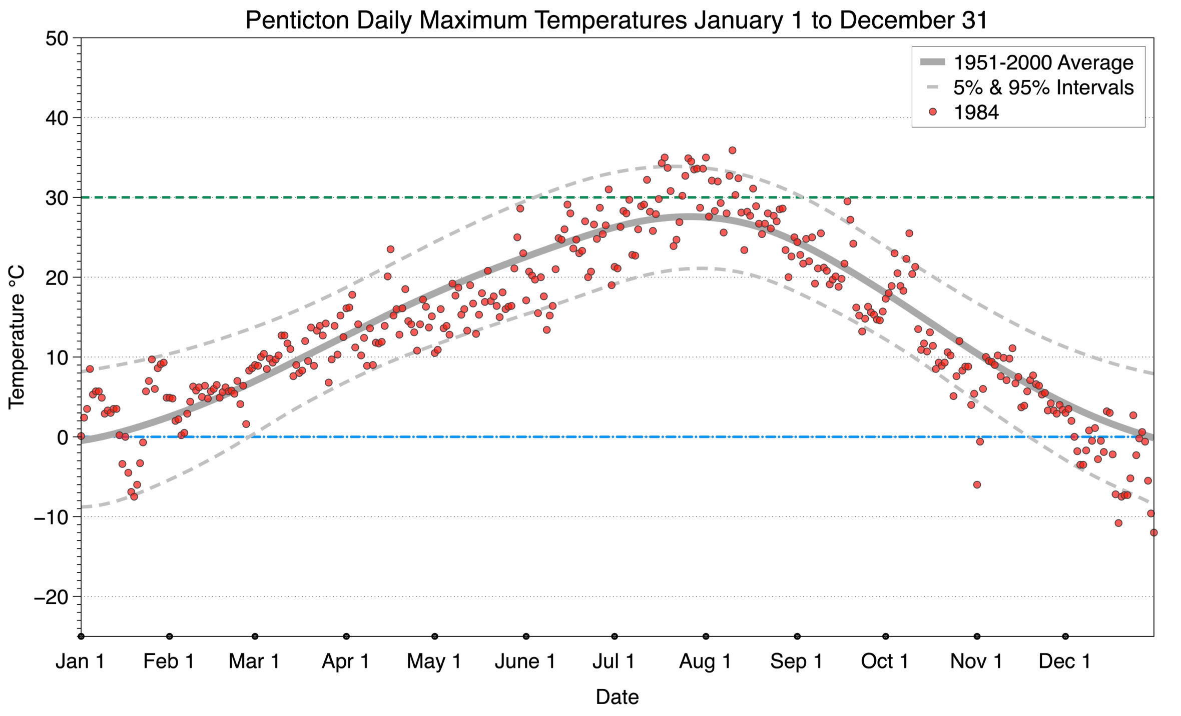 The graph below displays the day-to-day values of maximum daily temperature (red dots) at Penticton for the year 1984. On this graph, the dark grey thick center line is the average daily temperature calculated from 50 years of data from 1951 to 2000. The dotted light grey lines are the 5% and 95% probability intervals - about 90% of the data from 1951 to 2000 fell within these boundaries. Daily temperatures can be considered as extreme cold or extreme hot events if they that fall outside the 5% or 95% probability intervals, respectively. In Canada, temperatures above 30°C (green dashed line) are considered extreme daily temperatures.