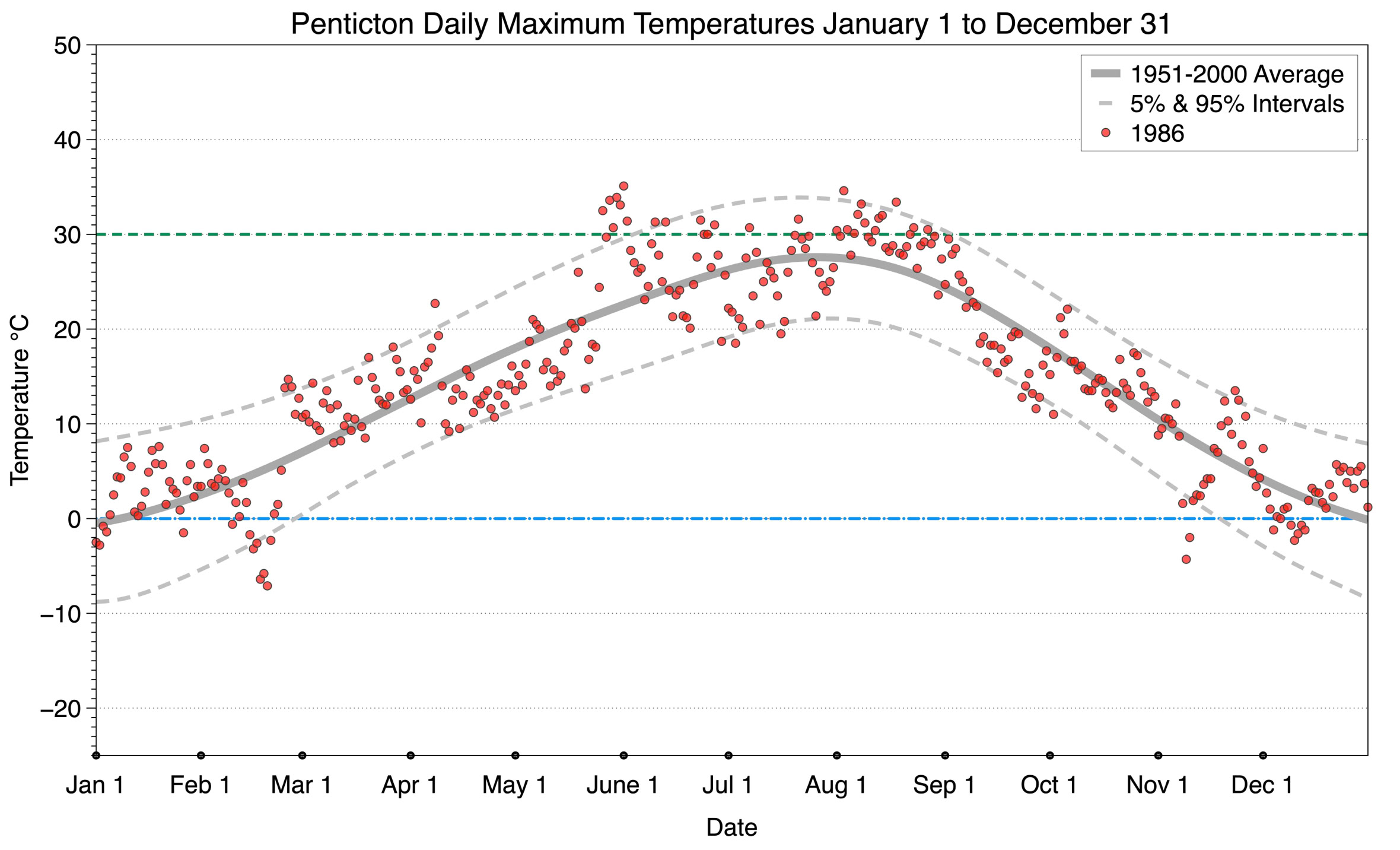 The graph below displays the day-to-day values of maximum daily temperature (red dots) at Penticton for the year 1986. On this graph, the dark grey thick center line is the average daily temperature calculated from 50 years of data from 1951 to 2000. The dotted light grey lines are the 5% and 95% probability intervals - about 90% of the data from 1951 to 2000 fell within these boundaries. Daily temperatures can be considered as extreme cold or extreme hot events if they that fall outside the 5% or 95% probability intervals, respectively. In Canada, temperatures above 30°C (green dashed line) are considered extreme daily temperatures.