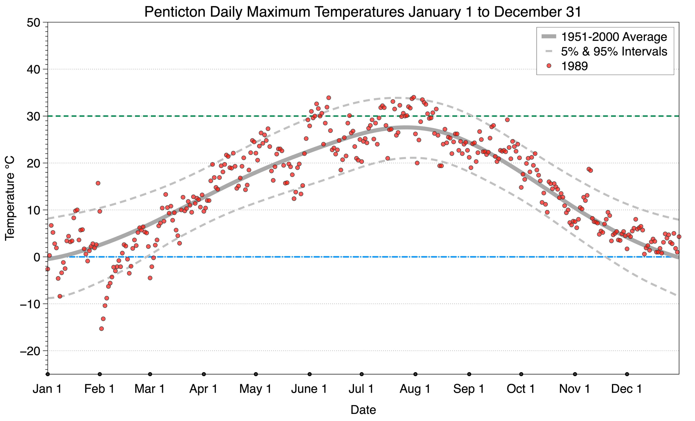 The graph below displays the day-to-day values of maximum daily temperature (red dots) at Penticton for the year 1989. On this graph, the dark grey thick center line is the average daily temperature calculated from 50 years of data from 1951 to 2000. The dotted light grey lines are the 5% and 95% probability intervals - about 90% of the data from 1951 to 2000 fell within these boundaries. Daily temperatures can be considered as extreme cold or extreme hot events if they that fall outside the 5% or 95% probability intervals, respectively. In Canada, temperatures above 30°C (green dashed line) are considered extreme daily temperatures.