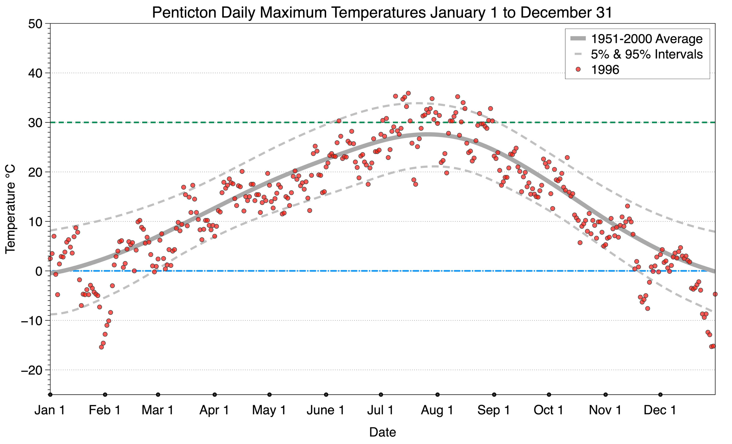 The graph below displays the day-to-day values of maximum daily temperature (red dots) at Penticton for the year 1996. On this graph, the dark grey thick center line is the average daily temperature calculated from 50 years of data from 1951 to 2000. The dotted light grey lines are the 5% and 95% probability intervals - about 90% of the data from 1951 to 2000 fell within these boundaries. Daily temperatures can be considered as extreme cold or extreme hot events if they that fall outside the 5% or 95% probability intervals, respectively. In Canada, temperatures above 30°C (green dashed line) are considered extreme daily temperatures.