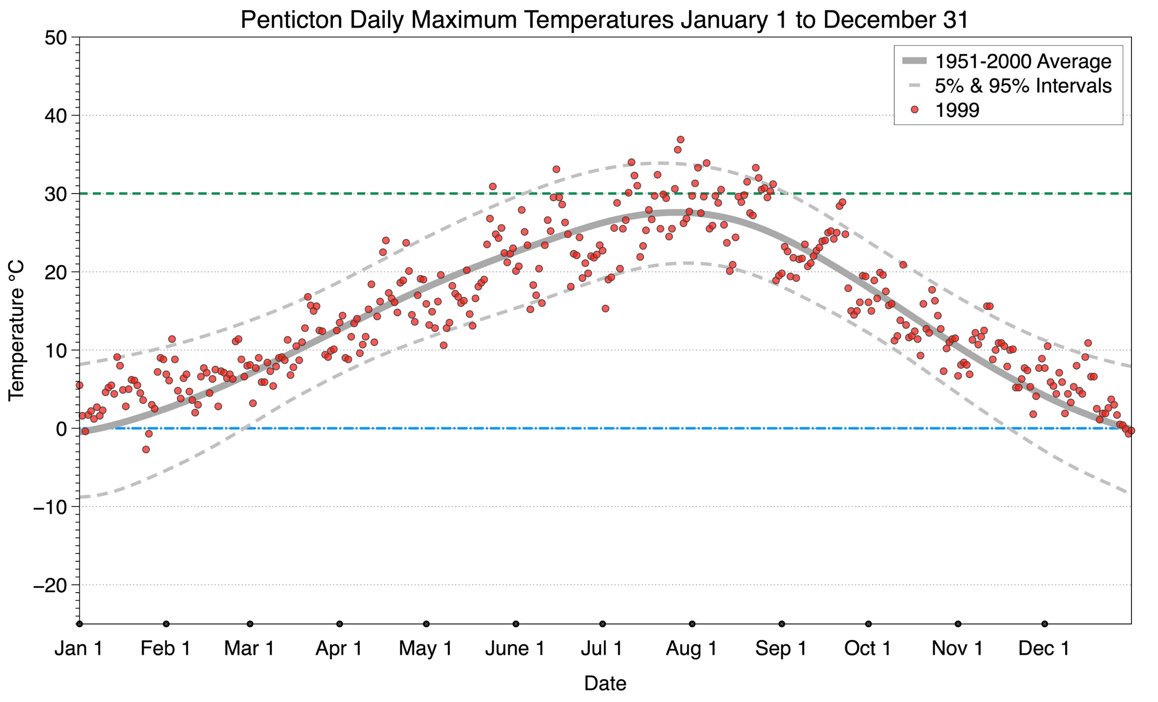 The graph below displays the day-to-day values of maximum daily temperature (red dots) at Penticton for the year 1999. On this graph, the dark grey thick center line is the average daily temperature calculated from 50 years of data from 1951 to 2000. The dotted light grey lines are the 5% and 95% probability intervals - about 90% of the data from 1951 to 2000 fell within these boundaries. Daily temperatures can be considered as extreme cold or extreme hot events if they that fall outside the 5% or 95% probability intervals, respectively. In Canada, temperatures above 30°C (green dashed line) are considered extreme daily temperatures.