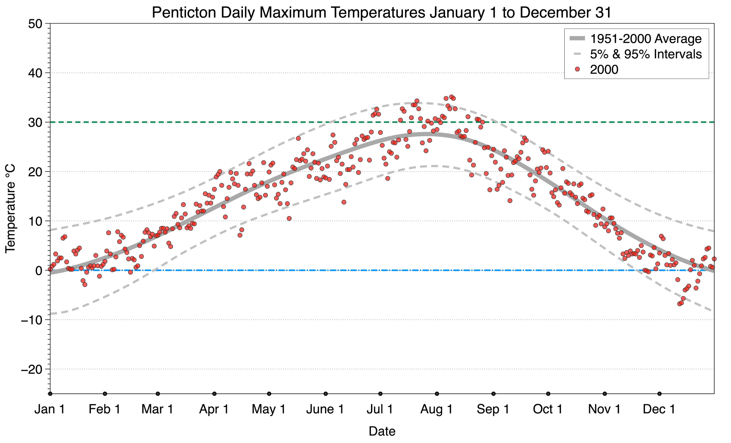 The graph below displays the day-to-day values of maximum daily temperature (red dots) at Penticton for the year 2000. On this graph, the dark grey thick center line is the average daily temperature calculated from 50 years of data from 1951 to 2000. The dotted light grey lines are the 5% and 95% probability intervals - about 90% of the data from 1951 to 2000 fell within these boundaries. Daily temperatures can be considered as extreme cold or extreme hot events if they that fall outside the 5% or 95% probability intervals, respectively. In Canada, temperatures above 30°C (green dashed line) are considered extreme daily temperatures.