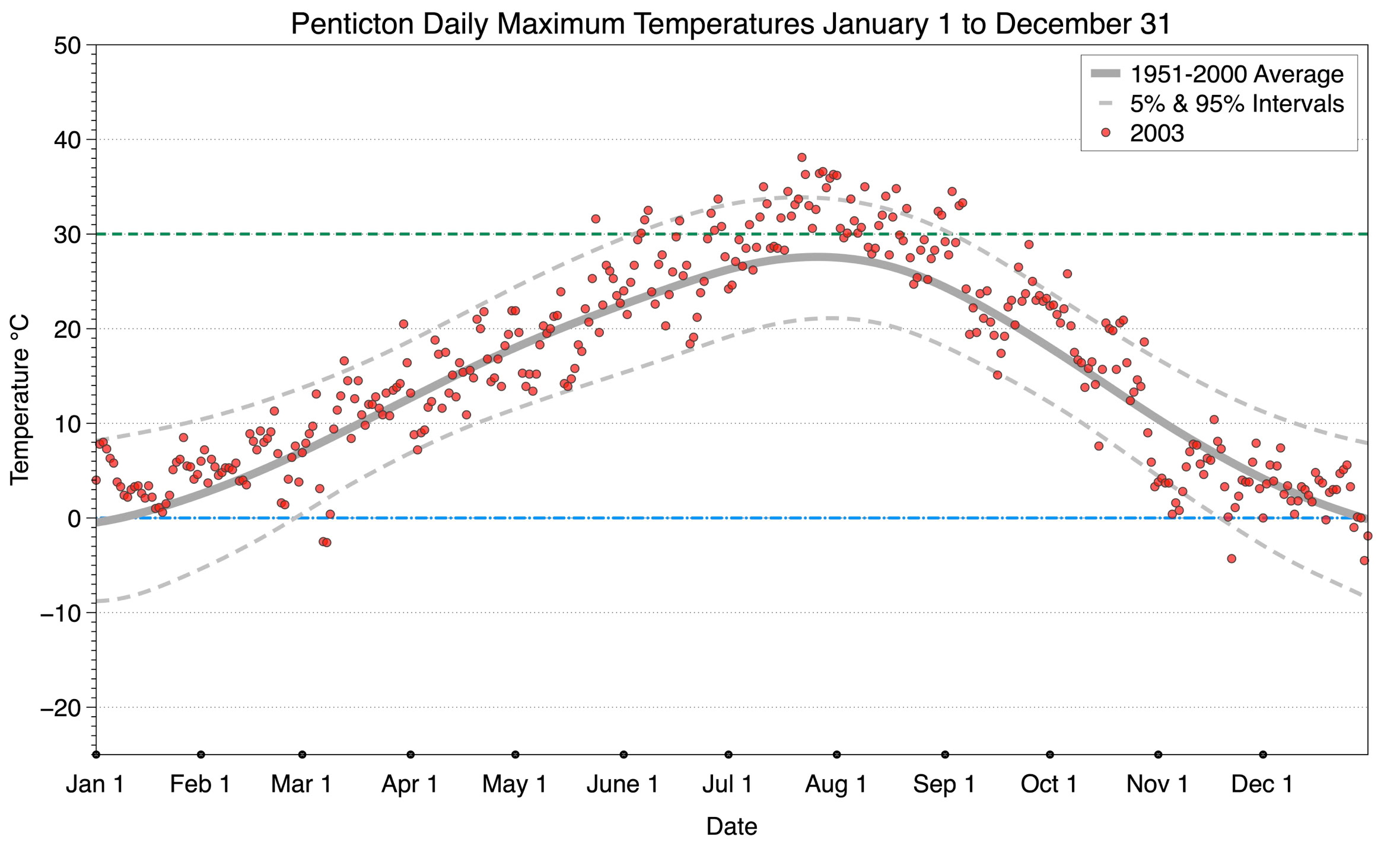 The graph below displays the day-to-day values of maximum daily temperature (red dots) at Penticton for the year 2003. On this graph, the dark grey thick center line is the average daily temperature calculated from 50 years of data from 1951 to 2000. The dotted light grey lines are the 5% and 95% probability intervals - about 90% of the data from 1951 to 2000 fell within these boundaries. Daily temperatures can be considered as extreme cold or extreme hot events if they that fall outside the 5% or 95% probability intervals, respectively. In Canada, temperatures above 30°C (green dashed line) are considered extreme daily temperatures.