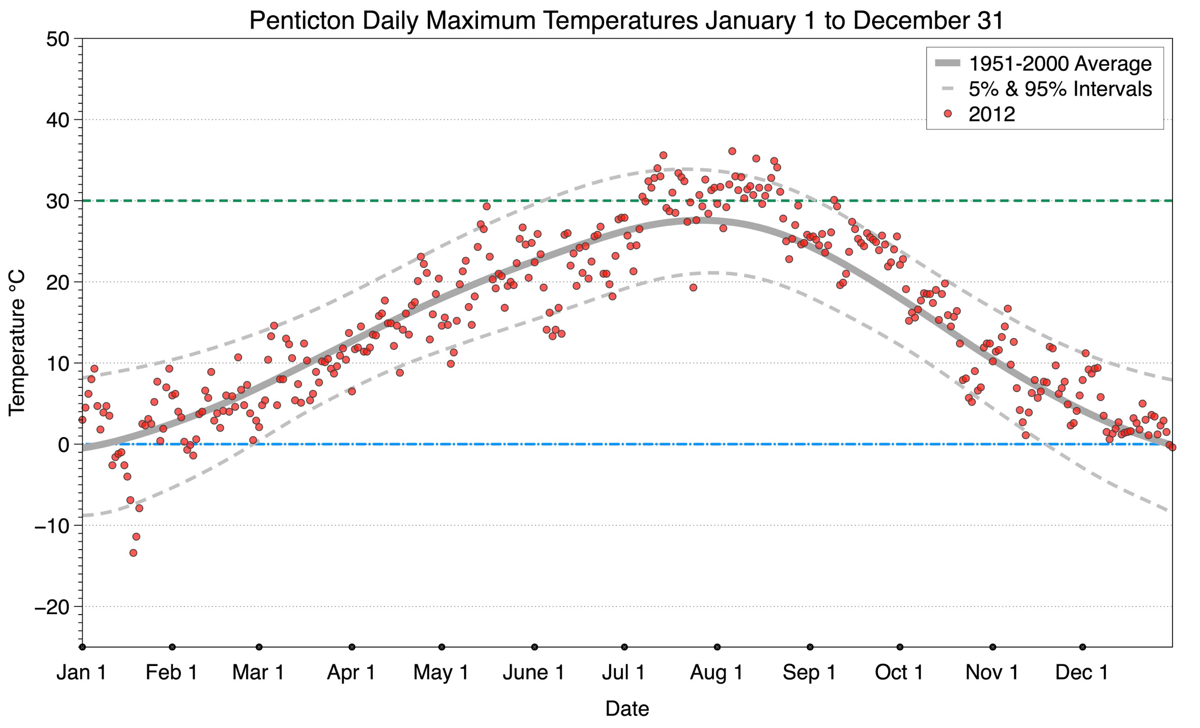 The graph below displays the day-to-day values of maximum daily temperature (red dots) at Penticton for the year 2012. On this graph, the dark grey thick center line is the average daily temperature calculated from 50 years of data from 1951 to 2000. The dotted light grey lines are the 5% and 95% probability intervals - about 90% of the data from 1951 to 2000 fell within these boundaries. Daily temperatures can be considered as extreme cold or extreme hot events if they that fall outside the 5% or 95% probability intervals, respectively. In Canada, temperatures above 30°C (green dashed line) are considered extreme daily temperatures.