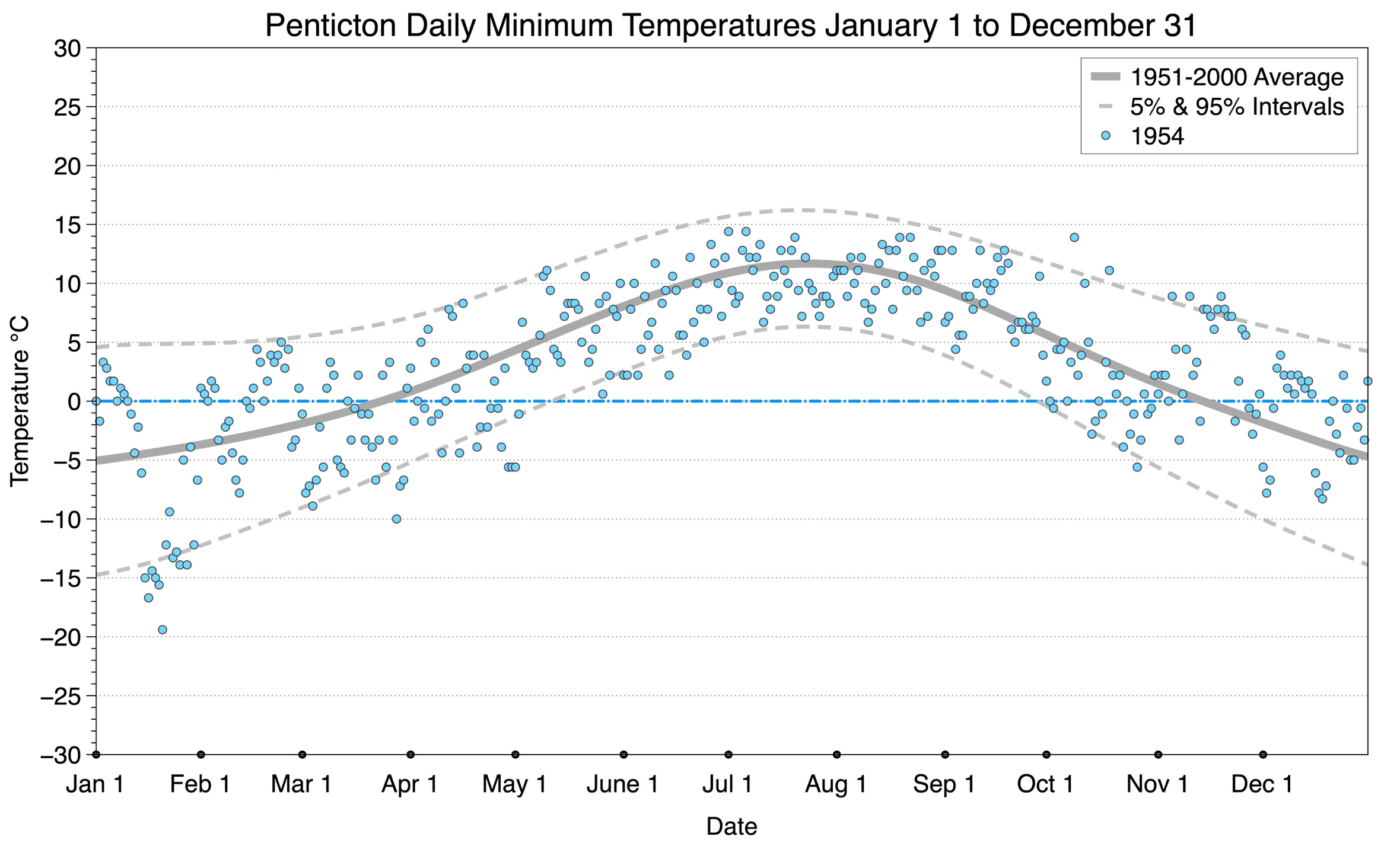 The graph below displays the day-to-day values of minimum daily temperature (blue dots) at Penticton for the year 1954. On this graph, the dark grey thick center line is the average daily temperature calculated from 50 years of data from 1951 to 2000. The dotted light grey lines are the 5% and 95% probability intervals - about 90% of the data from 1951 to 2000 fell within these boundaries. Daily temperatures can be considered as extreme cold or extreme hot events if they that fall outside the 5% or 95% probability intervals, respectively.