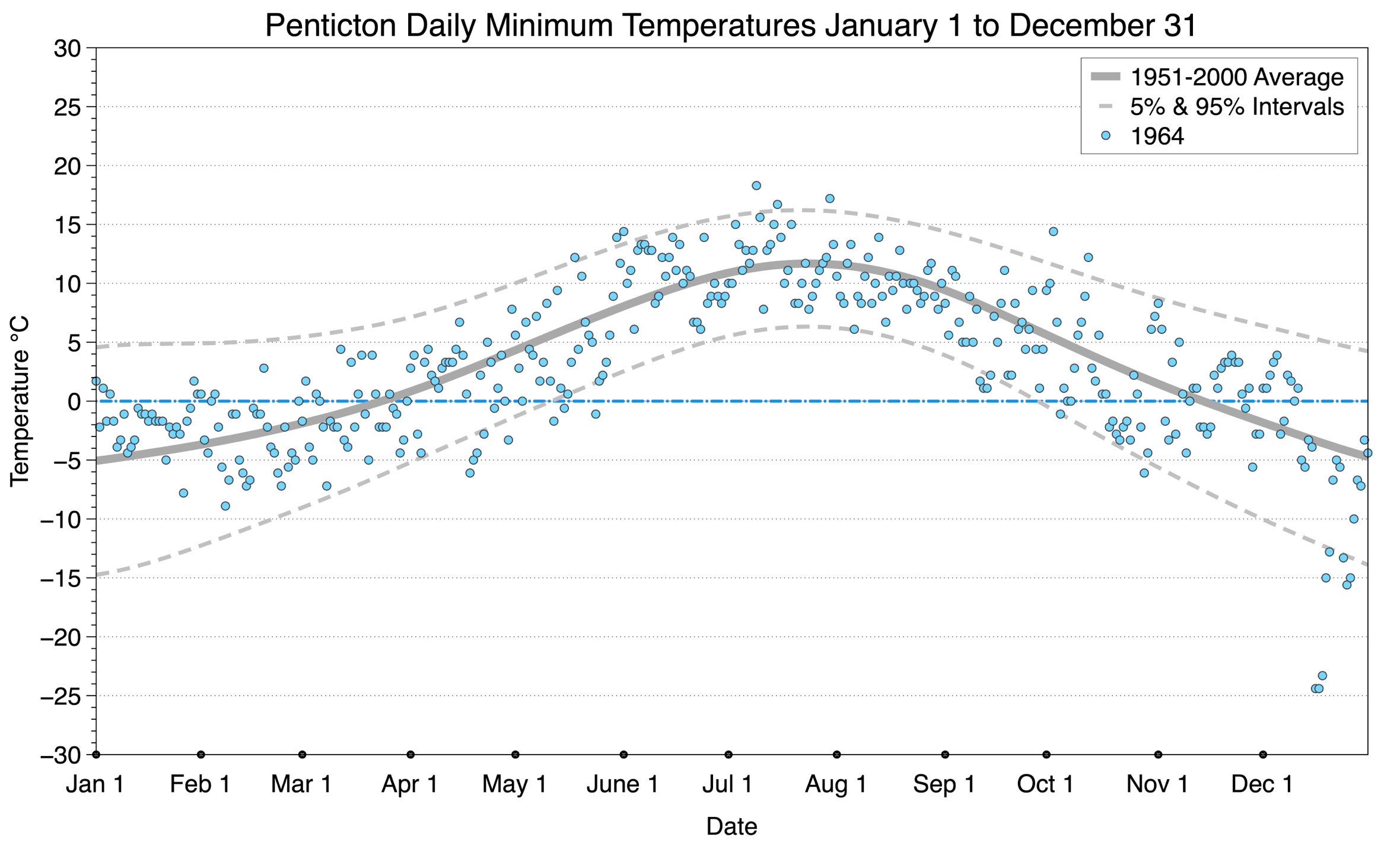 The graph below displays the day-to-day values of minimum daily temperature (blue dots) at Penticton for the year 1964. On this graph, the dark grey thick center line is the average daily temperature calculated from 50 years of data from 1951 to 2000. The dotted light grey lines are the 5% and 95% probability intervals - about 90% of the data from 1951 to 2000 fell within these boundaries. Daily temperatures can be considered as extreme cold or extreme hot events if they that fall outside the 5% or 95% probability intervals, respectively.