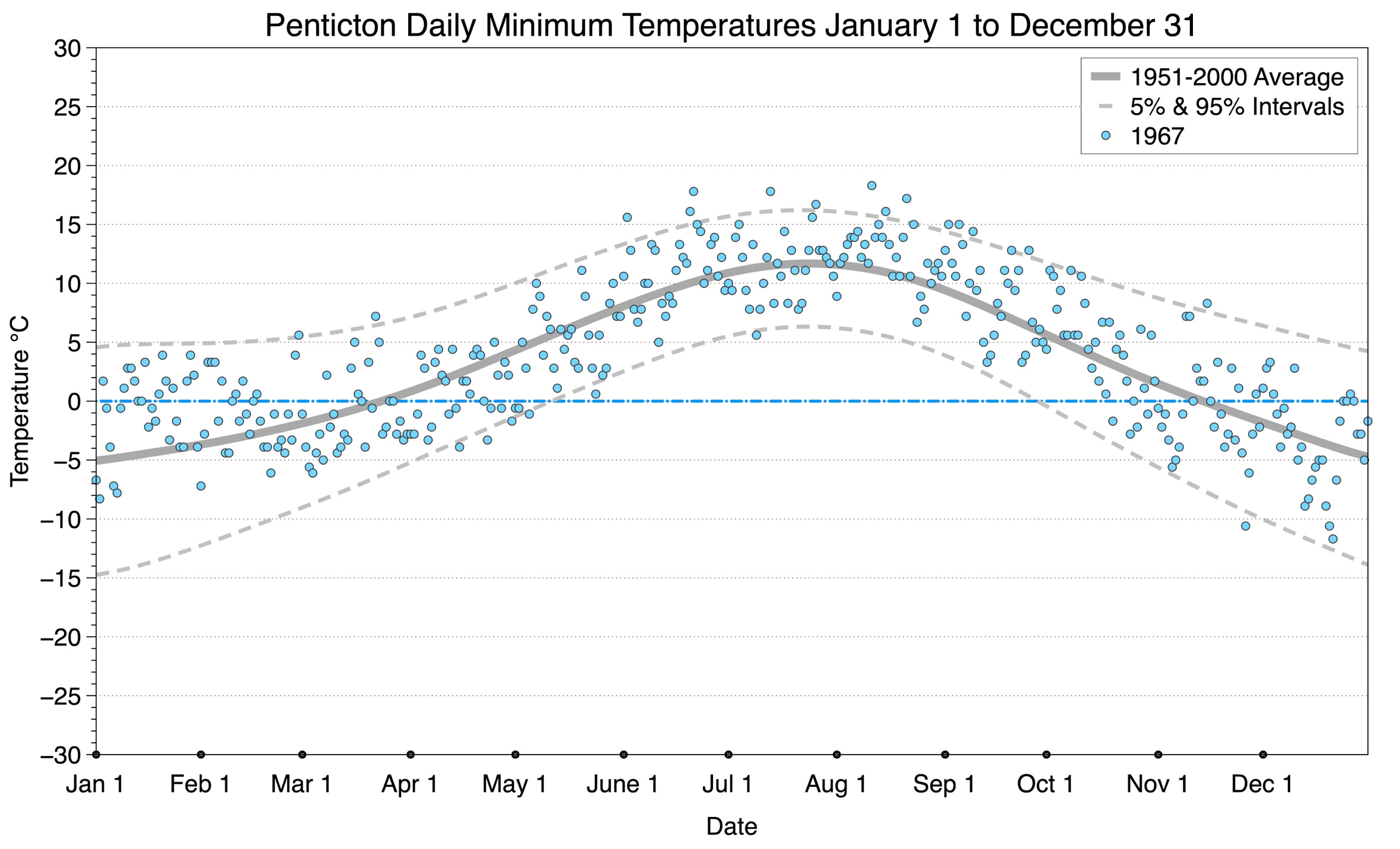 The graph below displays the day-to-day values of minimum daily temperature (blue dots) at Penticton for the year 1967. On this graph, the dark grey thick center line is the average daily temperature calculated from 50 years of data from 1951 to 2000. The dotted light grey lines are the 5% and 95% probability intervals - about 90% of the data from 1951 to 2000 fell within these boundaries. Daily temperatures can be considered as extreme cold or extreme hot events if they that fall outside the 5% or 95% probability intervals, respectively.