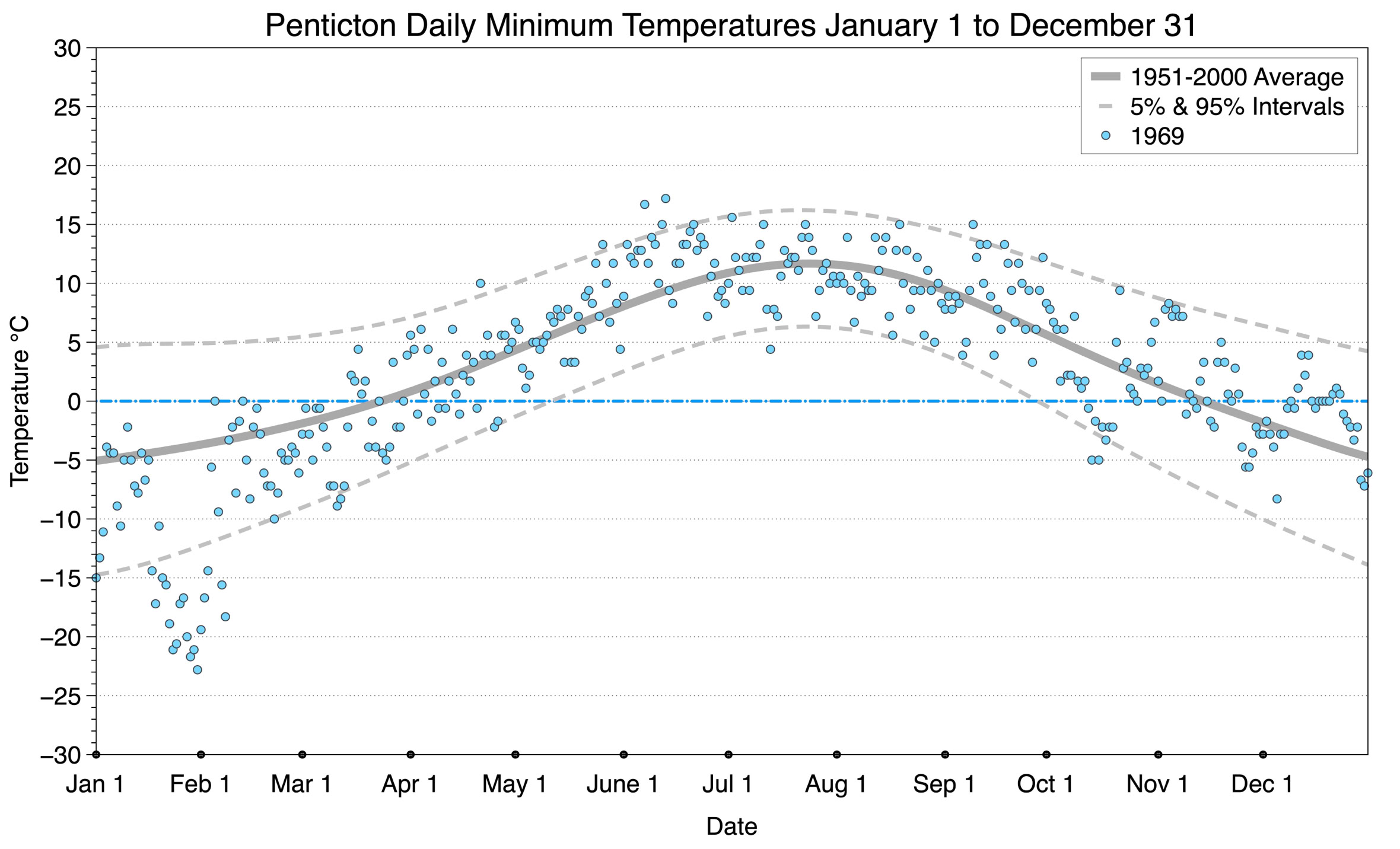 The graph below displays the day-to-day values of minimum daily temperature (blue dots) at Penticton for the year 1969. On this graph, the dark grey thick center line is the average daily temperature calculated from 50 years of data from 1951 to 2000. The dotted light grey lines are the 5% and 95% probability intervals - about 90% of the data from 1951 to 2000 fell within these boundaries. Daily temperatures can be considered as extreme cold or extreme hot events if they that fall outside the 5% or 95% probability intervals, respectively.