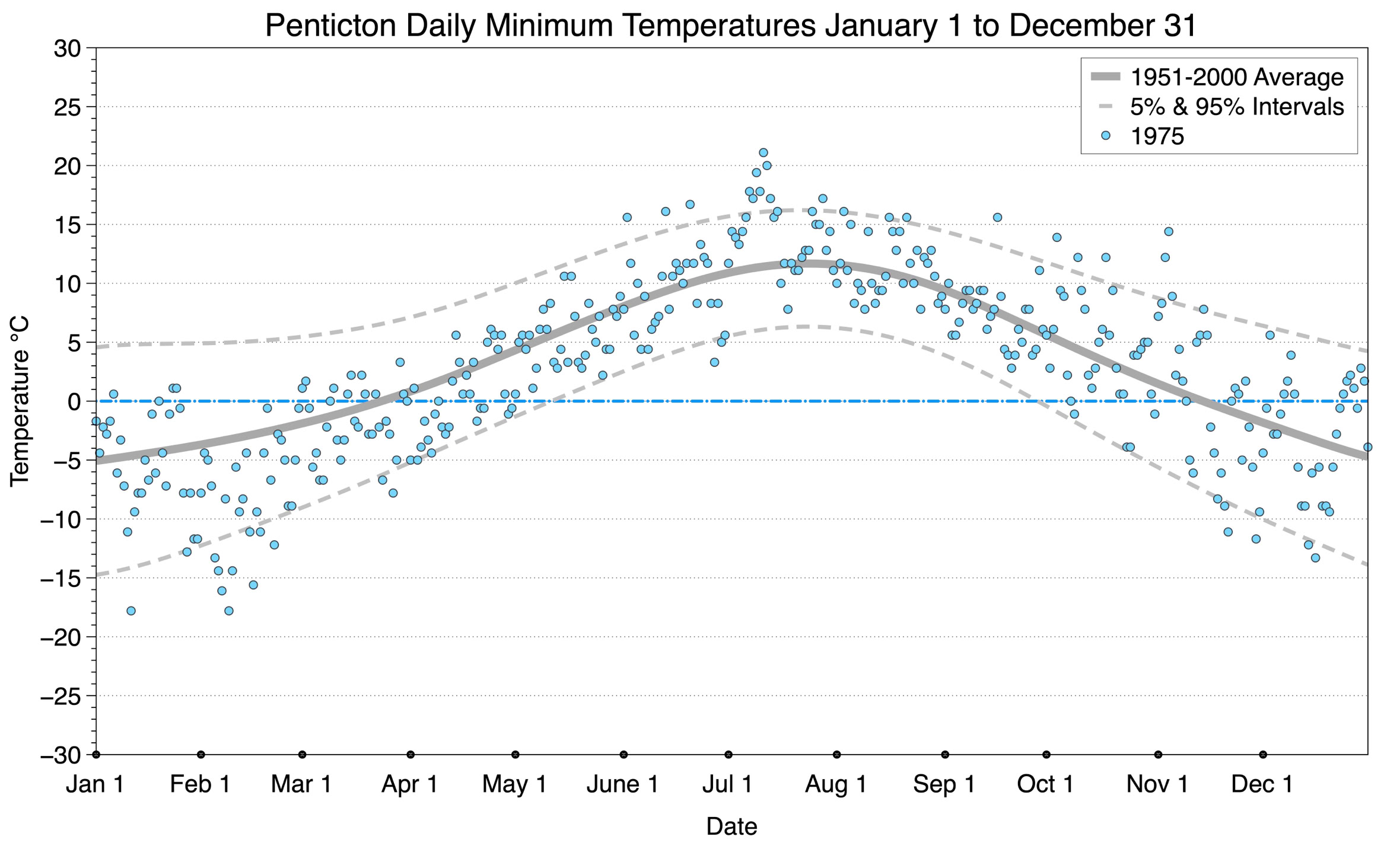 The graph below displays the day-to-day values of minimum daily temperature (blue dots) at Penticton for the year 1975. On this graph, the dark grey thick center line is the average daily temperature calculated from 50 years of data from 1951 to 2000. The dotted light grey lines are the 5% and 95% probability intervals - about 90% of the data from 1951 to 2000 fell within these boundaries. Daily temperatures can be considered as extreme cold or extreme hot events if they that fall outside the 5% or 95% probability intervals, respectively.