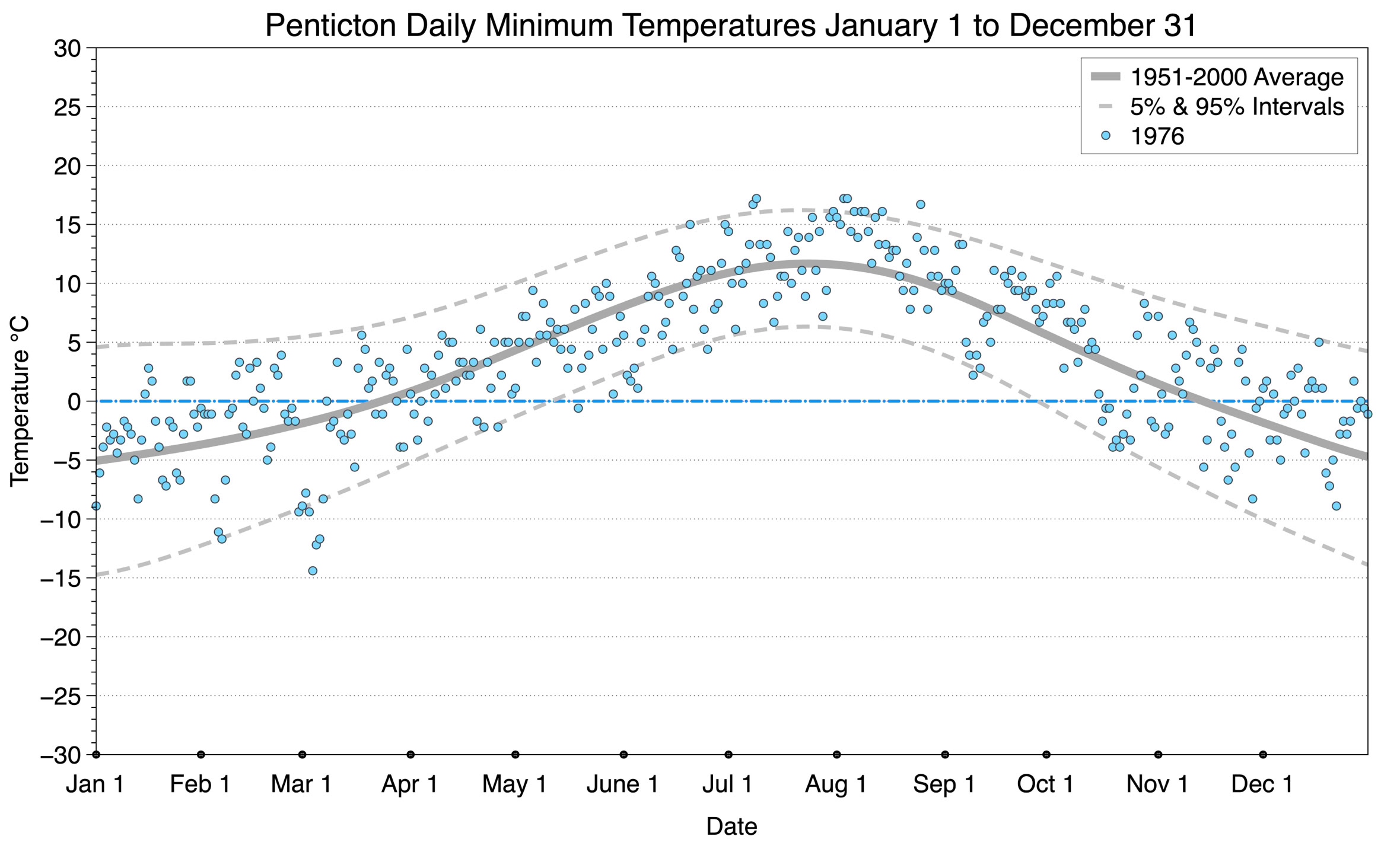 The graph below displays the day-to-day values of minimum daily temperature (blue dots) at Penticton for the year 1976. On this graph, the dark grey thick center line is the average daily temperature calculated from 50 years of data from 1951 to 2000. The dotted light grey lines are the 5% and 95% probability intervals - about 90% of the data from 1951 to 2000 fell within these boundaries. Daily temperatures can be considered as extreme cold or extreme hot events if they that fall outside the 5% or 95% probability intervals, respectively.