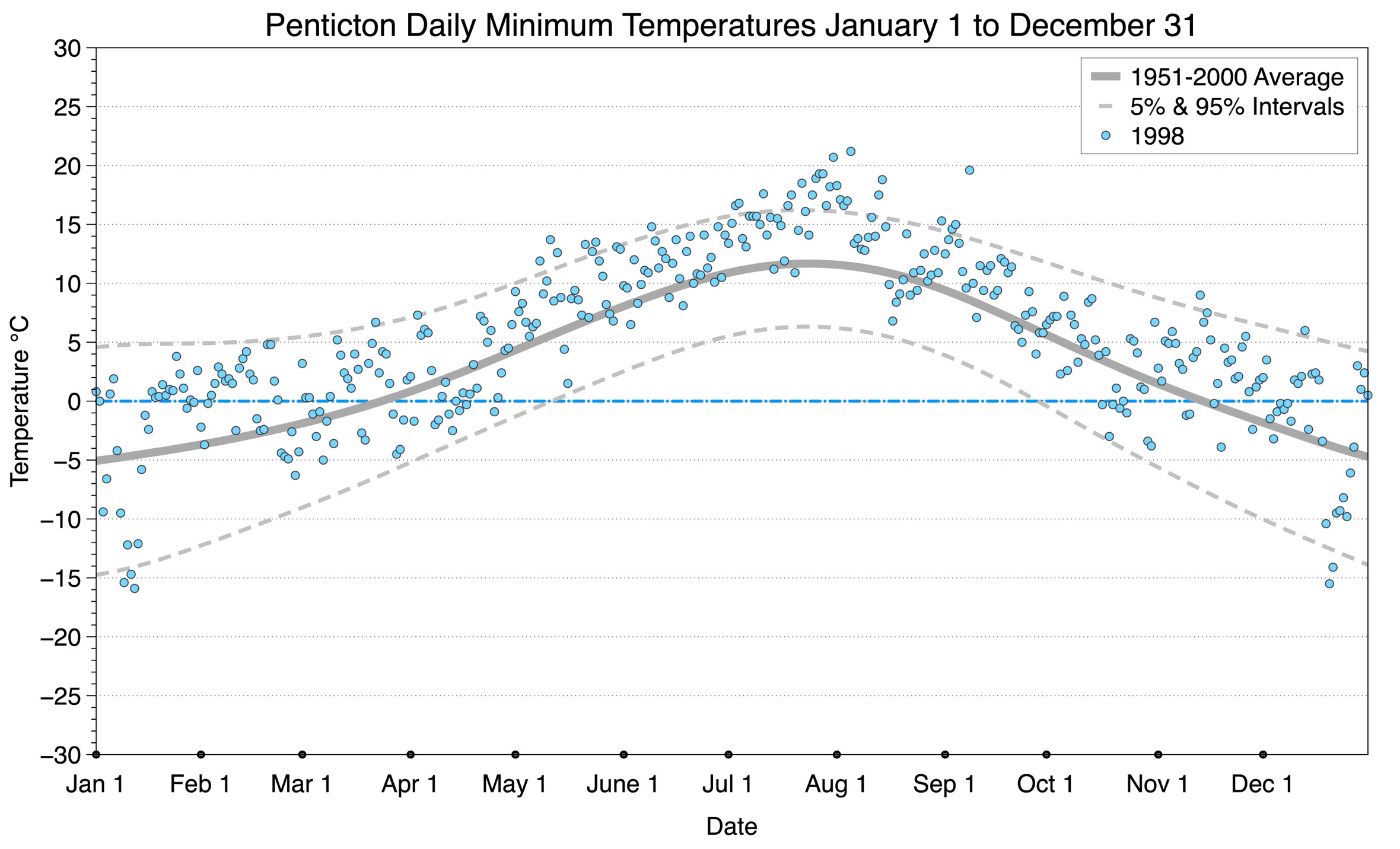 The graph below displays the day-to-day values of minimum daily temperature (blue dots) at Penticton for the year 1998. On this graph, the dark grey thick center line is the average daily temperature calculated from 50 years of data from 1951 to 2000. The dotted light grey lines are the 5% and 95% probability intervals - about 90% of the data from 1951 to 2000 fell within these boundaries. Daily temperatures can be considered as extreme cold or extreme hot events if they that fall outside the 5% or 95% probability intervals, respectively.