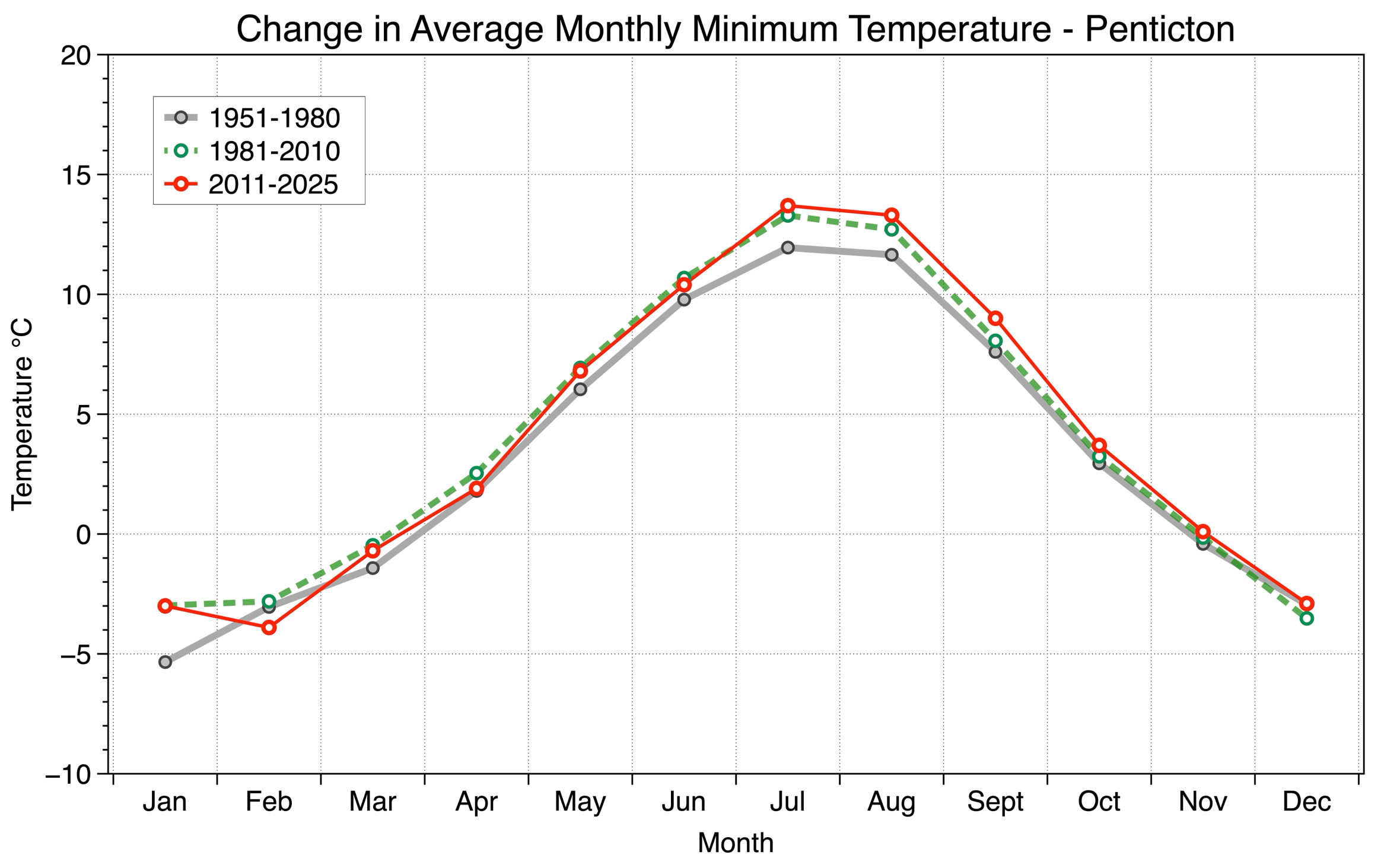 Figure 9 The historical change in average monthly minimum temperatures for three periods: 1951 to 1980, 1981 to 2010, and 2011 to 2025.
