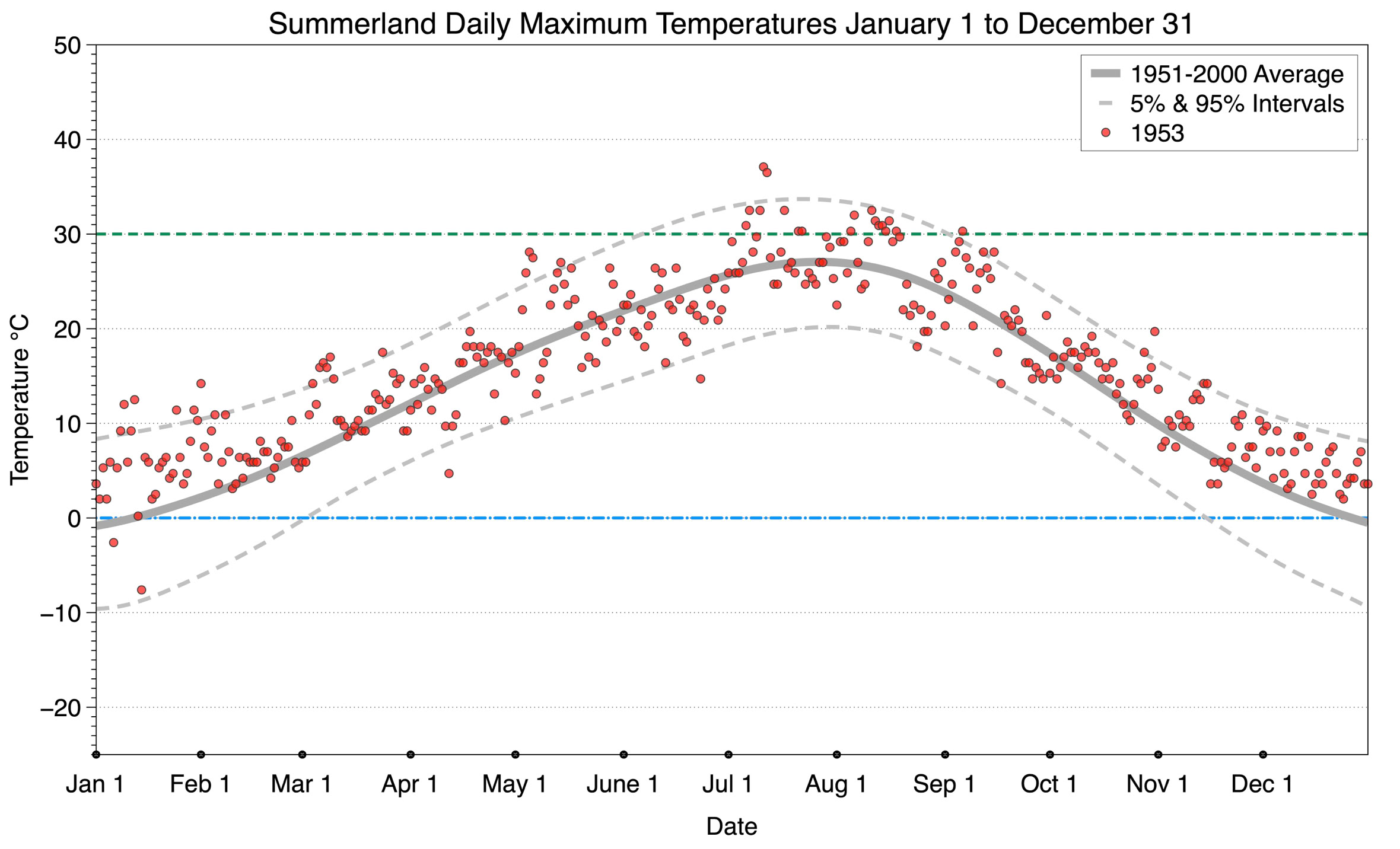 The graph below displays the day-to-day values of maximum daily temperature (red dots) at Summerland for the year 1953. On this graph, the dark grey thick center line is the average daily temperature calculated from 50 years of data from 1951 to 2000. The dotted light grey lines are the 5% and 95% probability intervals - about 90% of the data from 1951 to 2000 fell within these boundaries. Daily temperatures can be considered as extreme cold or extreme hot events if they that fall outside the 5% or 95% probability intervals, respectively. In Canada, temperatures above 30°C (green dotted line) are considered extreme daily temperatures.