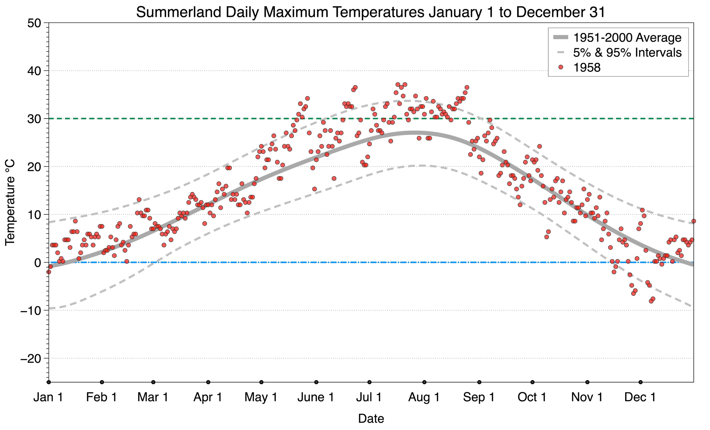 The graph below displays the day-to-day values of maximum daily temperature (red dots) at Summerland for the year 1958. On this graph, the dark grey thick center line is the average daily temperature calculated from 50 years of data from 1951 to 2000. The dotted light grey lines are the 5% and 95% probability intervals - about 90% of the data from 1951 to 2000 fell within these boundaries. Daily temperatures can be considered as extreme cold or extreme hot events if they that fall outside the 5% or 95% probability intervals, respectively. In Canada, temperatures above 30°C (green dotted line) are considered extreme daily temperatures.