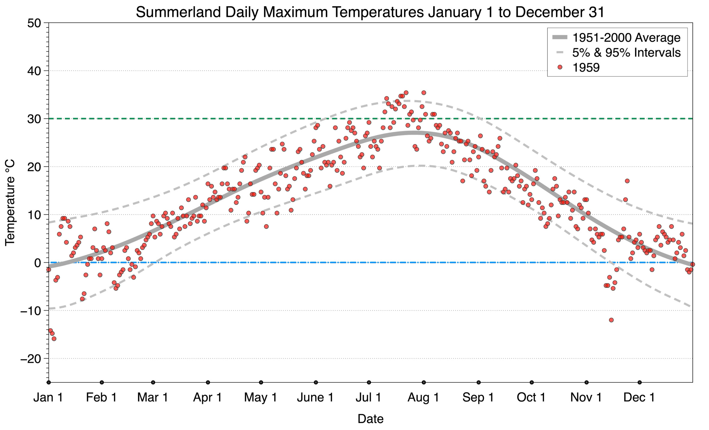 The graph below displays the day-to-day values of maximum daily temperature (red dots) at Summerland for the year 1959. On this graph, the dark grey thick center line is the average daily temperature calculated from 50 years of data from 1951 to 2000. The dotted light grey lines are the 5% and 95% probability intervals - about 90% of the data from 1951 to 2000 fell within these boundaries. Daily temperatures can be considered as extreme cold or extreme hot events if they that fall outside the 5% or 95% probability intervals, respectively. In Canada, temperatures above 30°C (green dotted line) are considered extreme daily temperatures.
