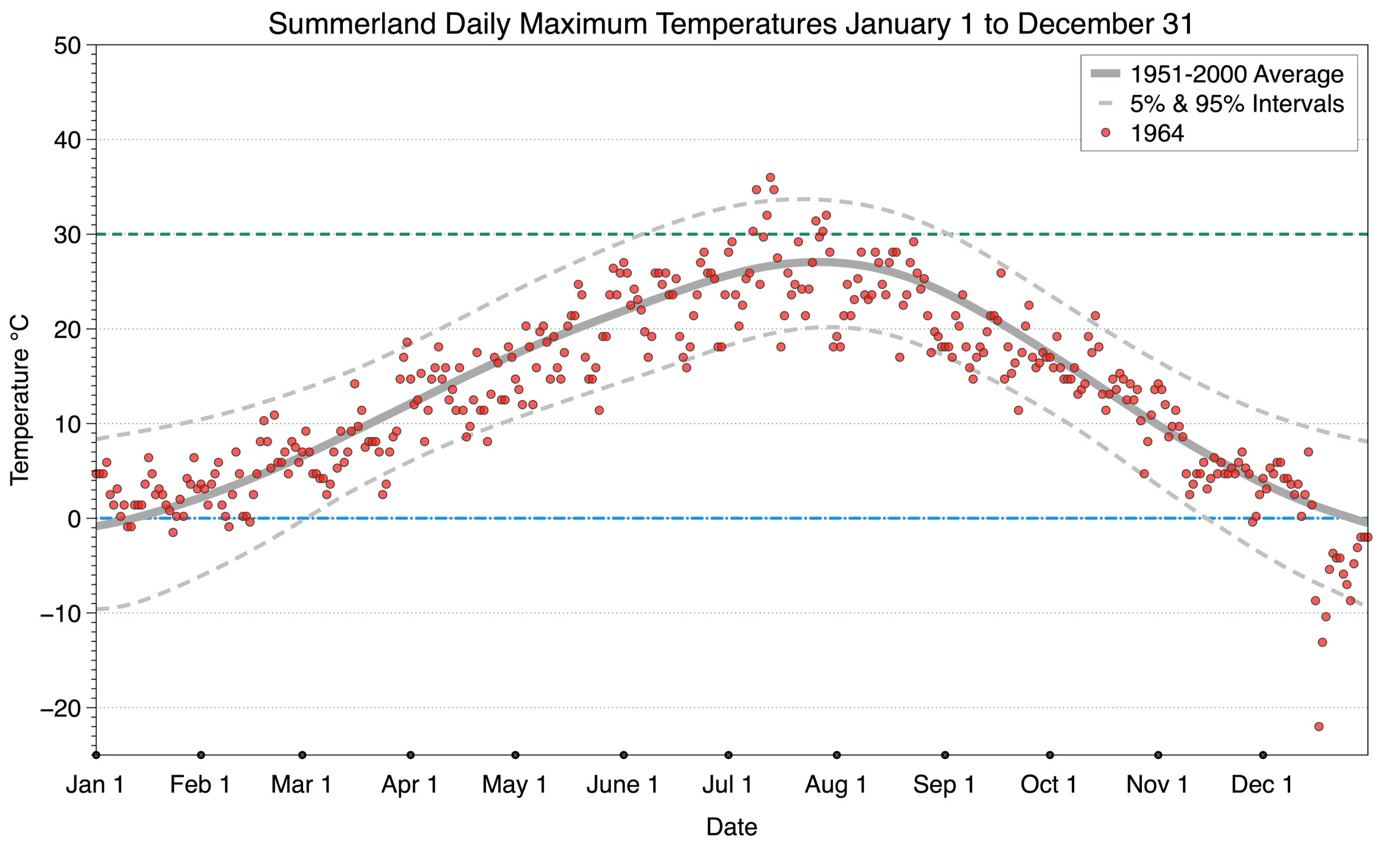 The graph below displays the day-to-day values of maximum daily temperature (red dots) at Summerland for the year 1964. On this graph, the dark grey thick center line is the average daily temperature calculated from 50 years of data from 1951 to 2000. The dotted light grey lines are the 5% and 95% probability intervals - about 90% of the data from 1951 to 2000 fell within these boundaries. Daily temperatures can be considered as extreme cold or extreme hot events if they that fall outside the 5% or 95% probability intervals, respectively. In Canada, temperatures above 30°C (green dotted line) are considered extreme daily temperatures.